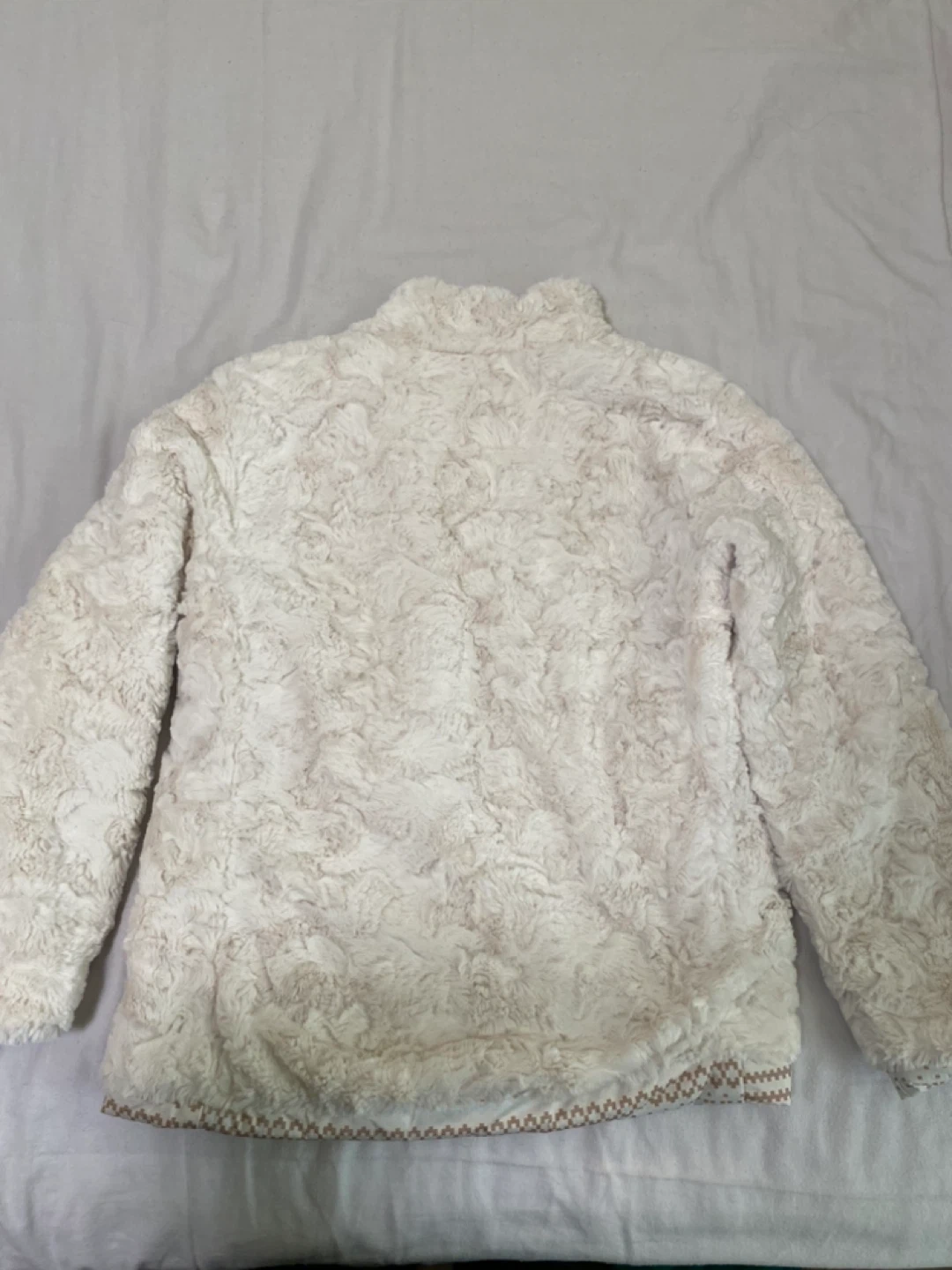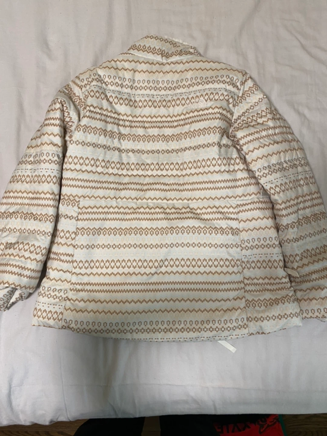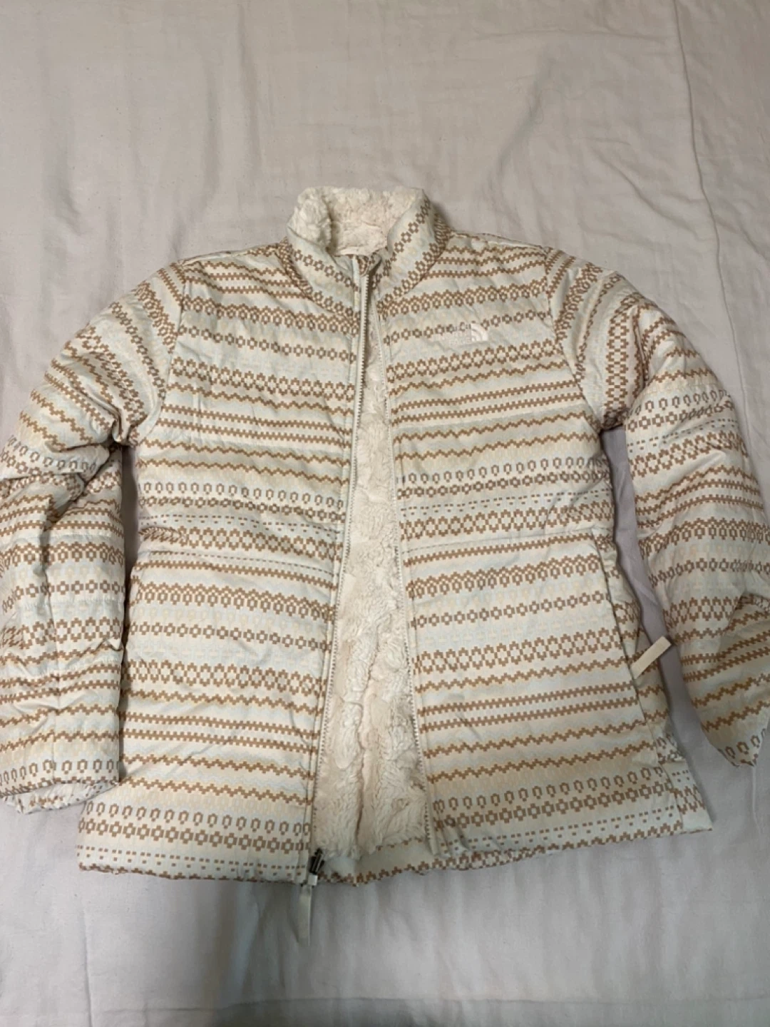37Selling a reversible jacket from The North Face. It's a girls' size L (14/16). One side is a cozy, furry white, and the other is patterned with white and tan stripes. Great for layering!