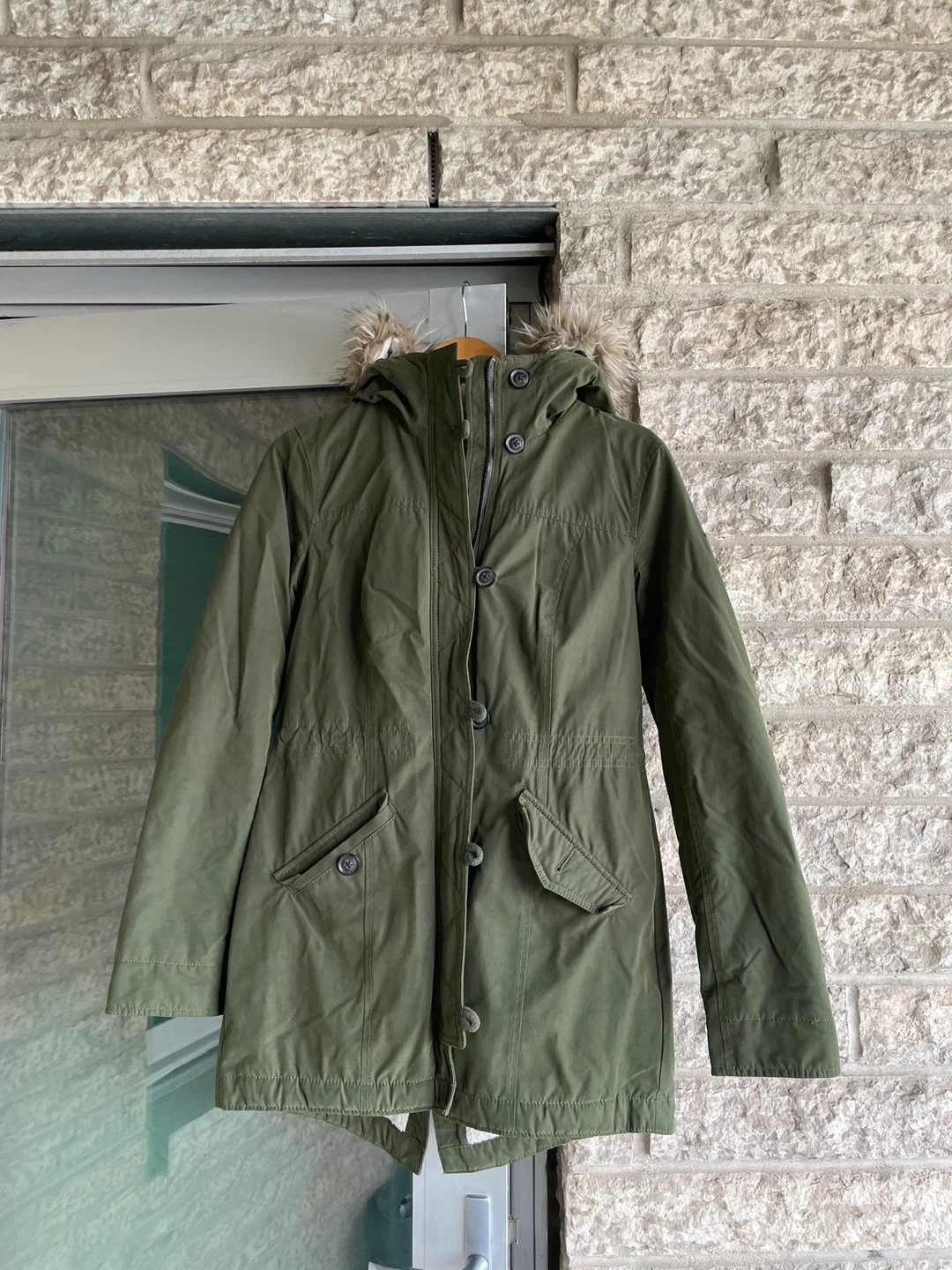 Selling a Hollister winter parka in olive green! It's a size small and has a faux fur trim on the hood. Perfect for staying warm during the cold Canadian winters