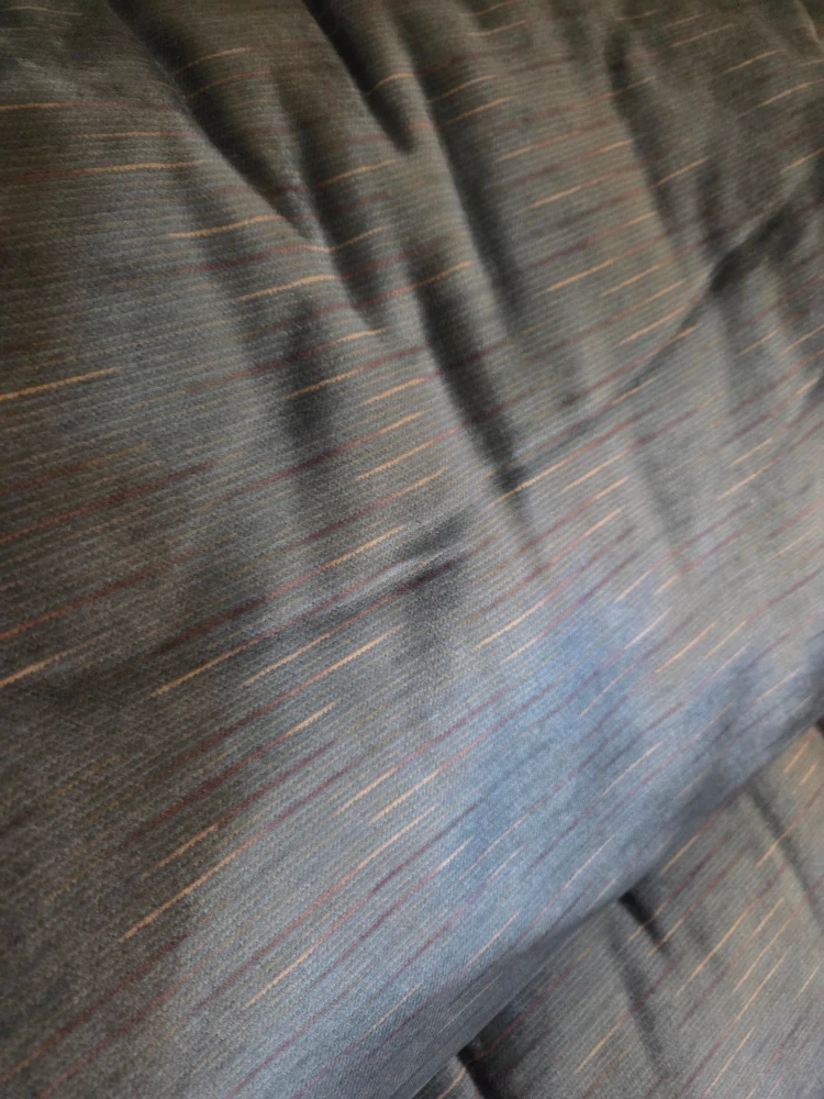 Selling a comfy dual-reclining loveseat from a smoke-free, pet-free, and kid-free home. It has a wall-hugging feature that prevents dents, scuffs, and chips to your walls when reclining, making it perfect for a household with kids! The fabric is blue with little decorative gray and brown horizontal lines and is gently used with no rips, tears, or stains. Perfect for a living room or cozy corner of a den.