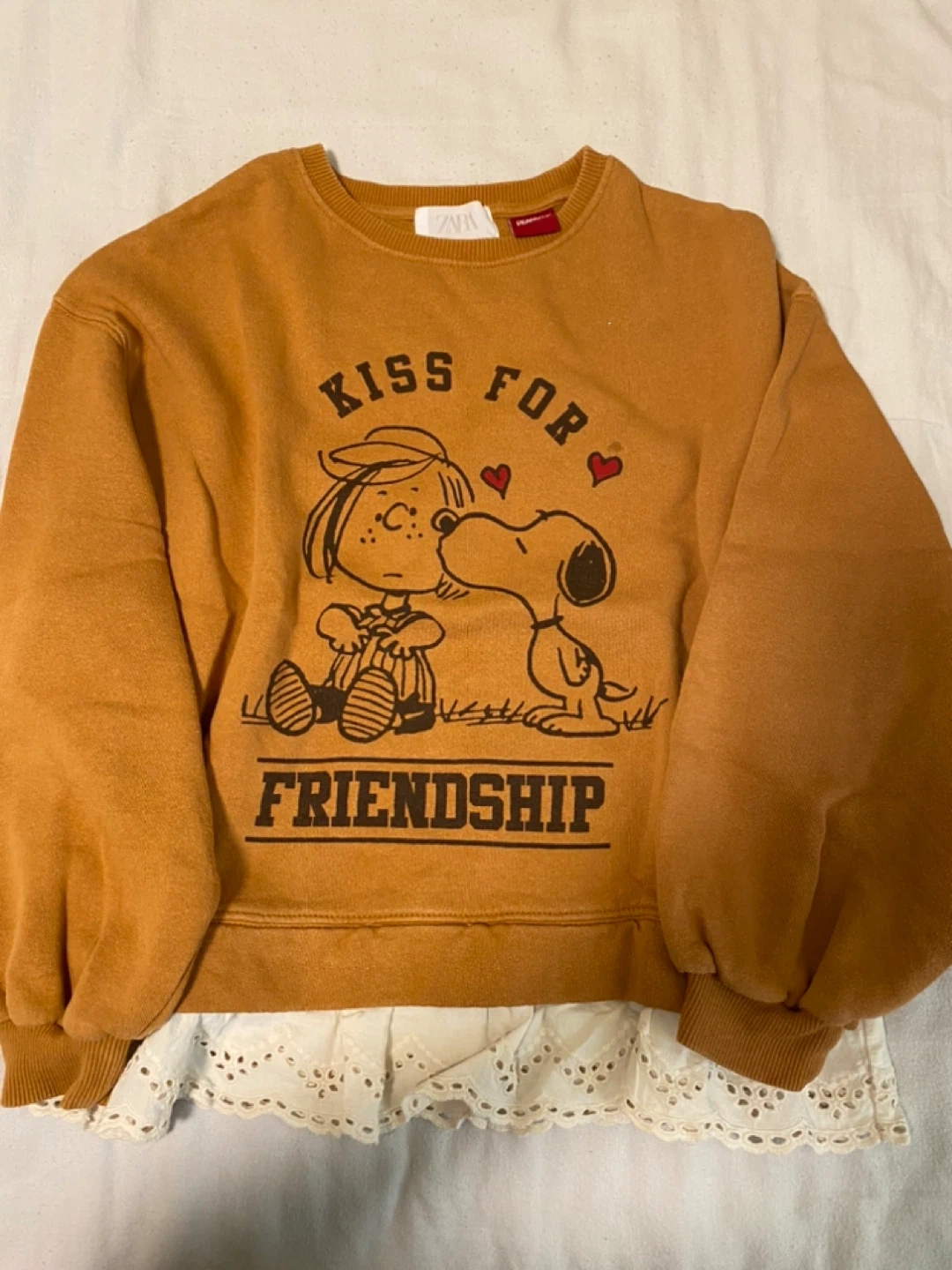 A cute Zara sweatshirt featuring Snoopy and friends! It's a brown colour and frills. Made with 83% cotton and 17% polyester 13-14Yr 160cm