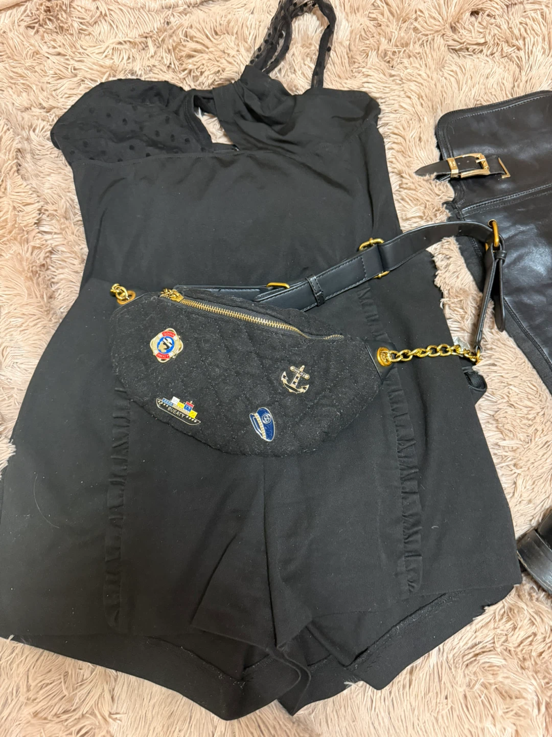 A stylish black quilted belt bag featuring a gold-tone chain and a red interior. It's perfect for keeping your essentials close while adding a touch of chic to your outfit! The bag has a zip closure and an adjustable belt strap.