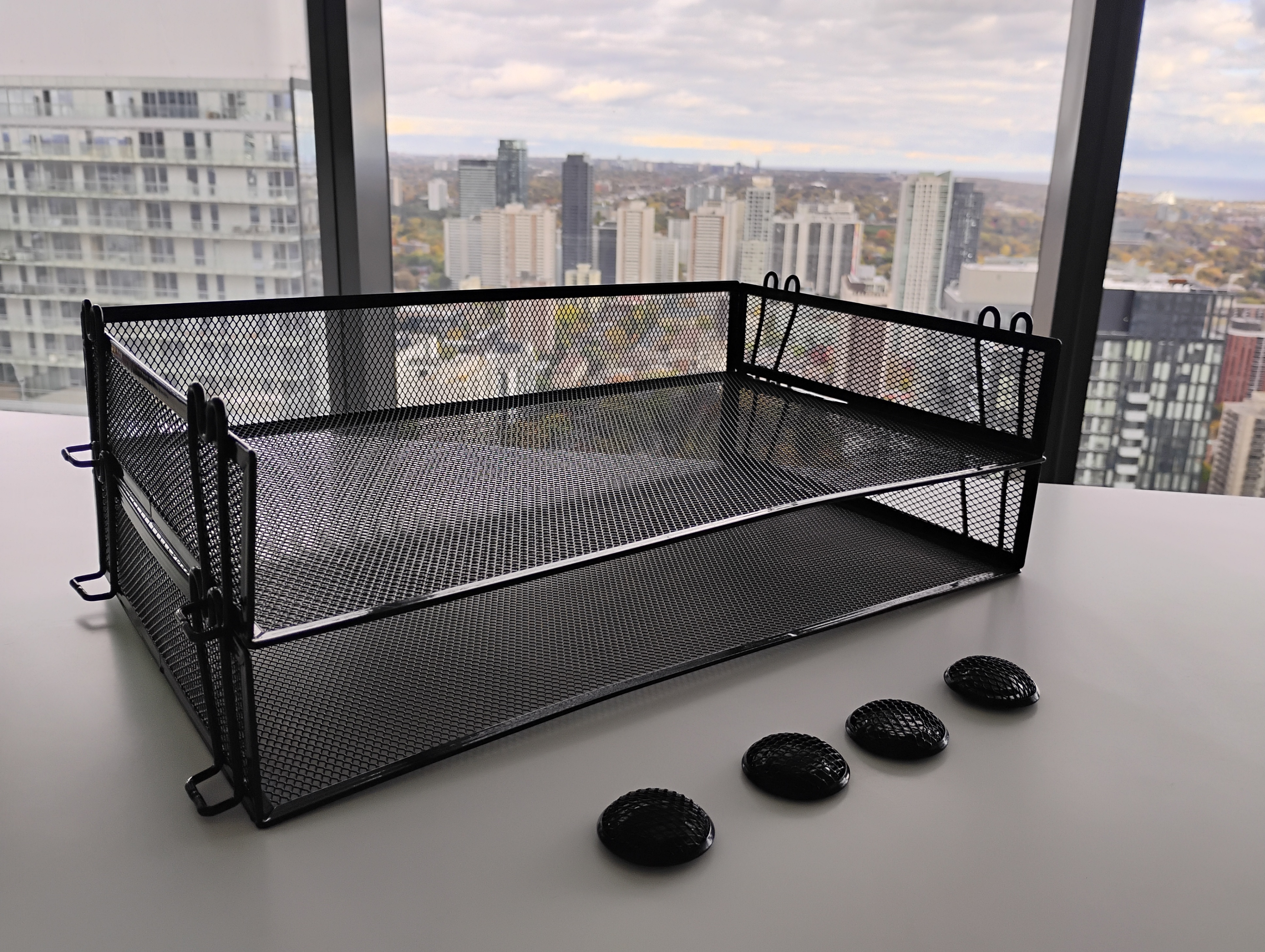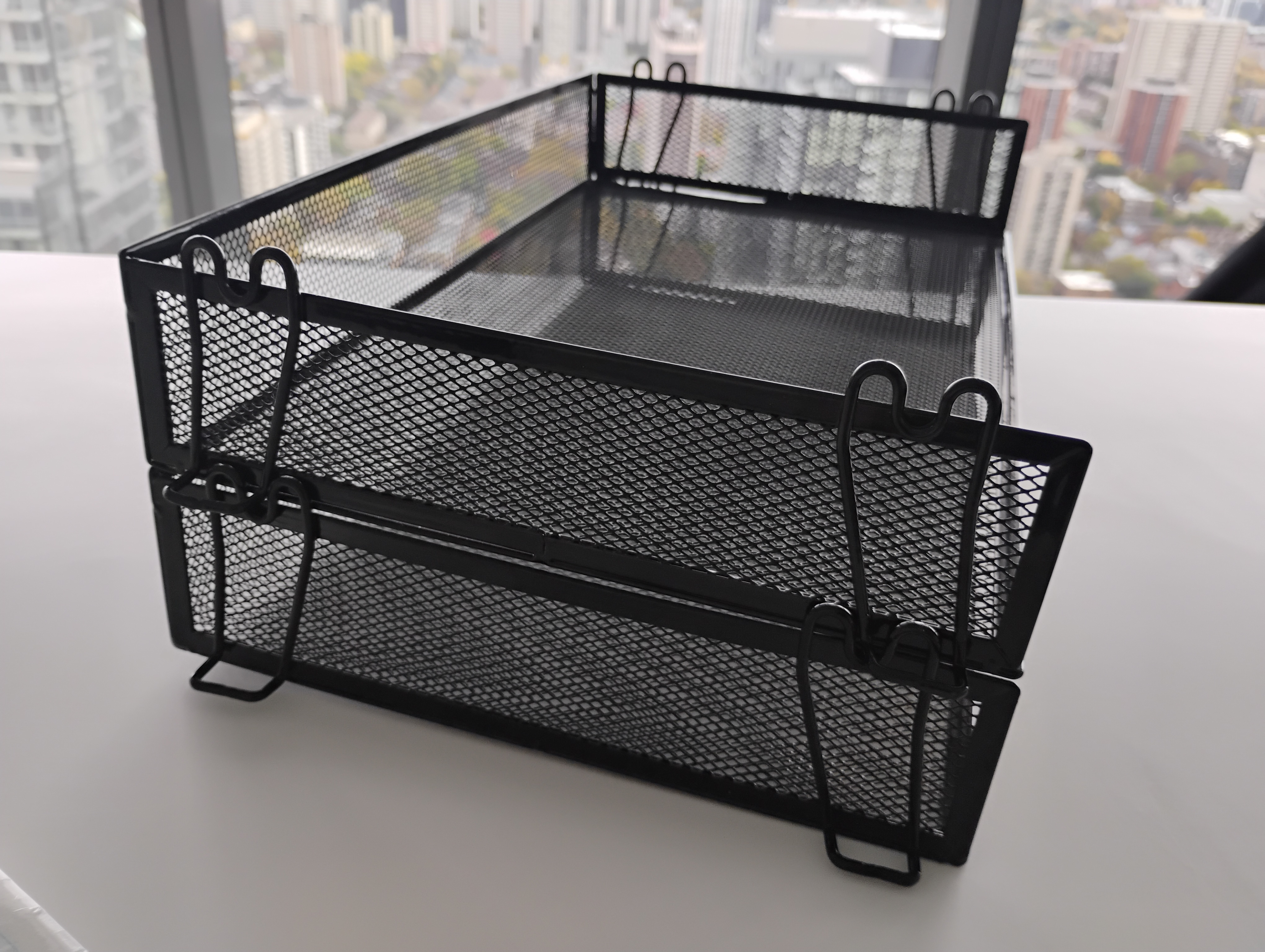 Organize your papers and keep track of reminders with this desk organizer. Comes with 2 stackable black metal mesh trays that lock into place + 4 magnets.