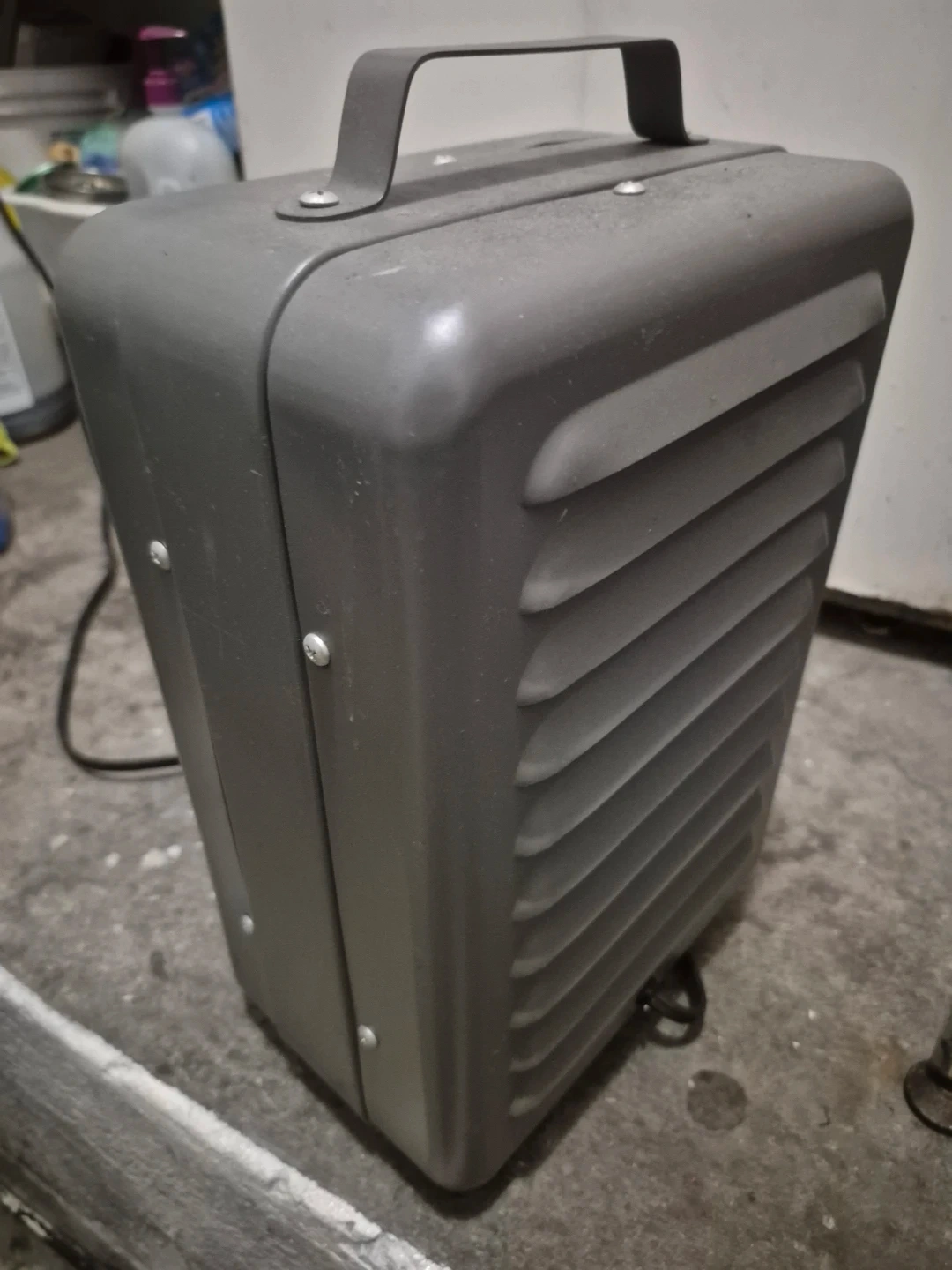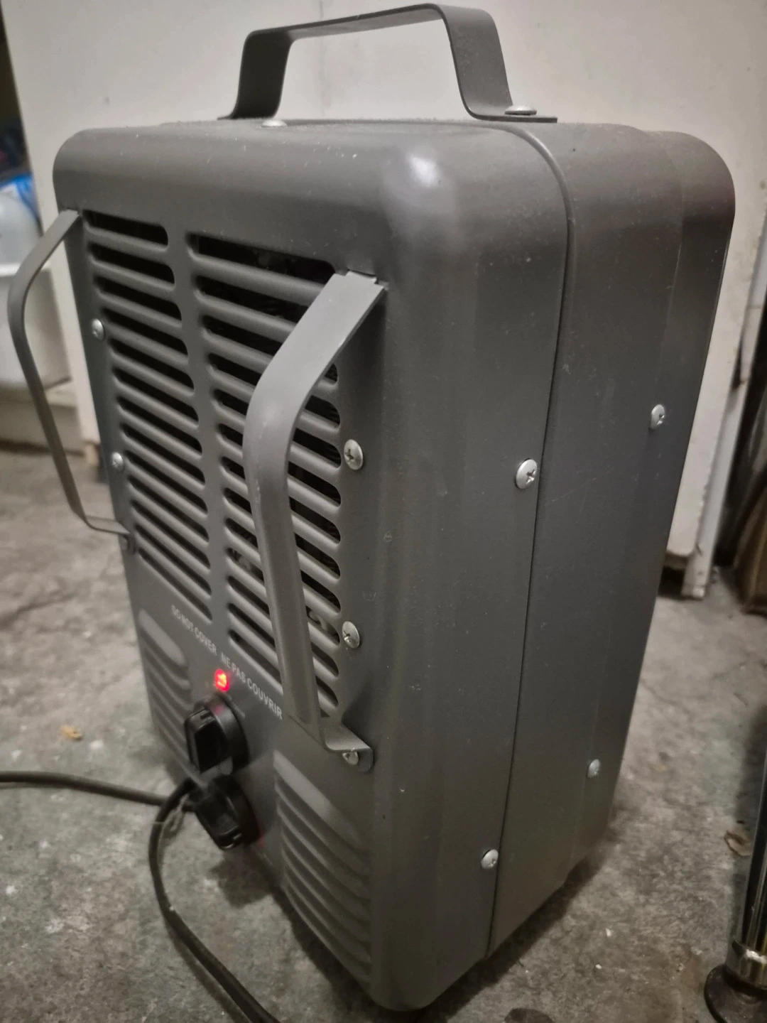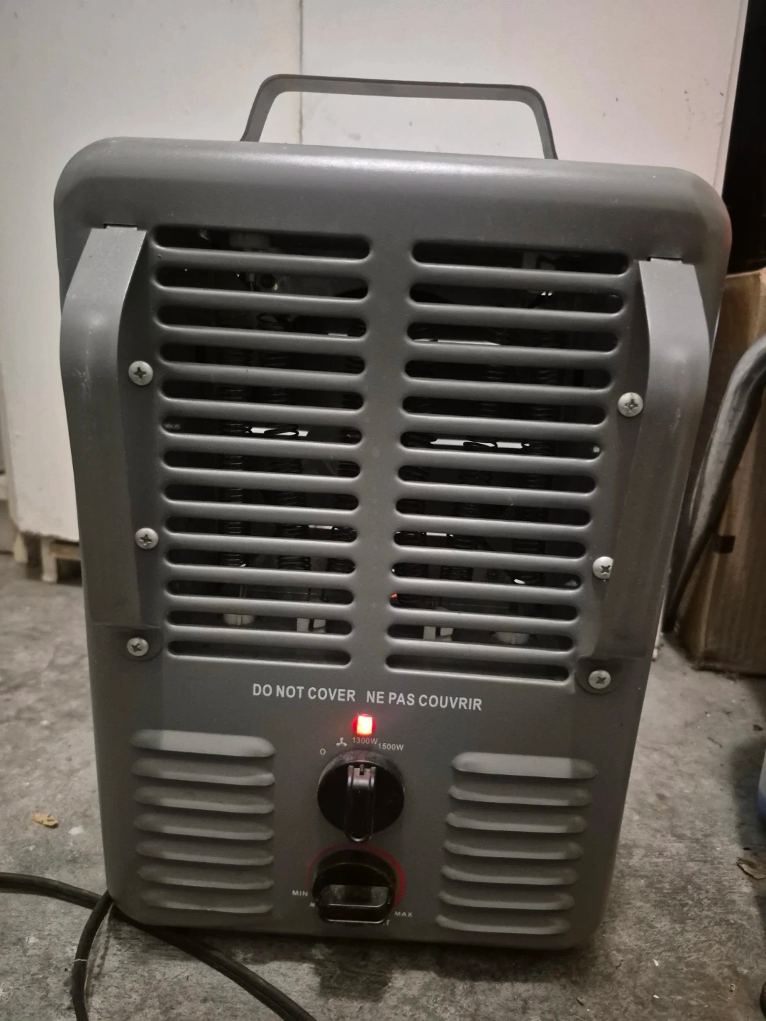39Selling a portable space heater in grey. It has a handle for easy carrying and is in good working condition. It has a dial to adjust the heat settings from min to max, and it can be set to 1000W or 1500W. Perfect for heating up a small space quickly