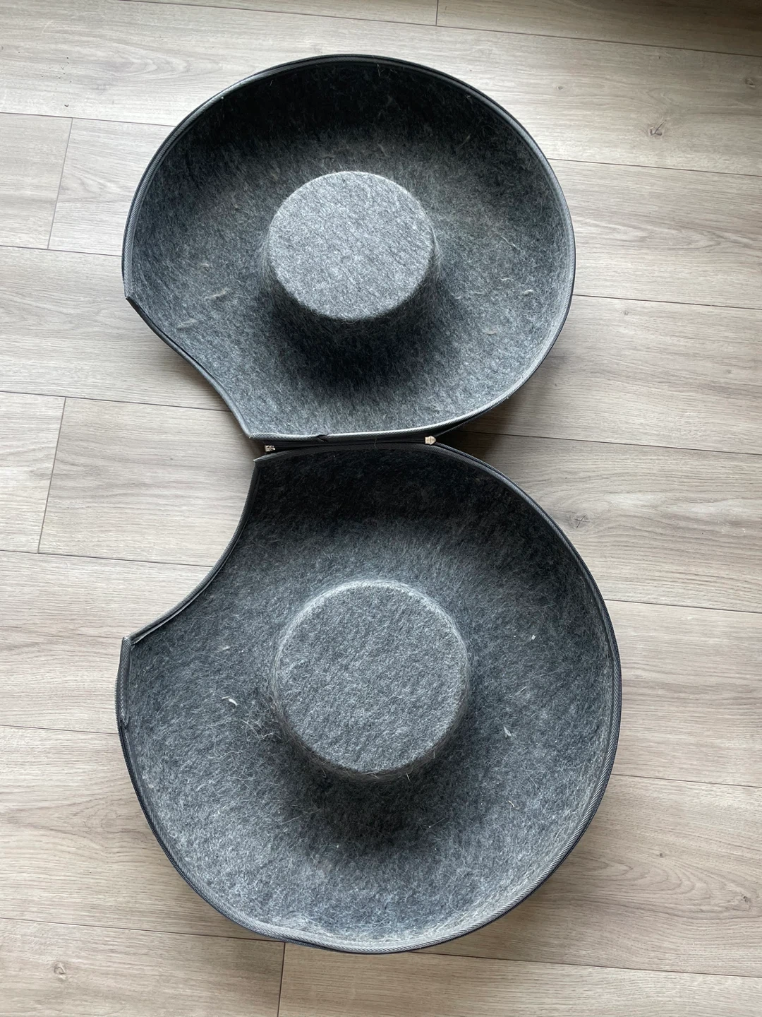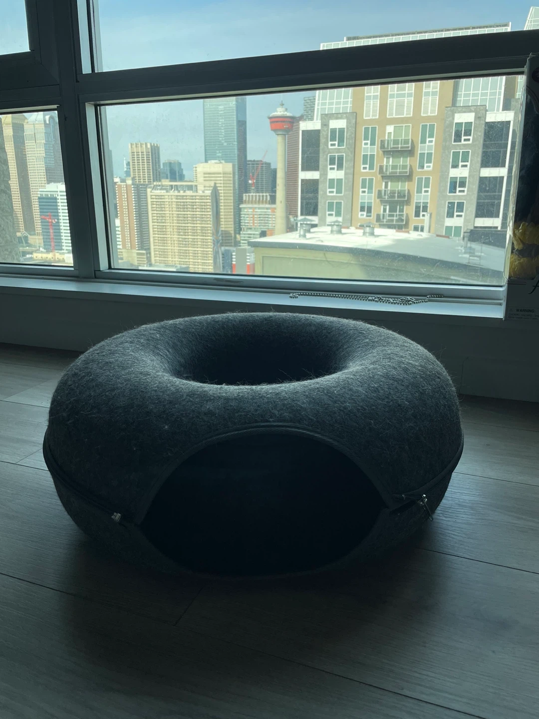 Selling a cozy donut-shaped cat bed in great condition! It's a stylish and comfortable spot for your furry friend to curl up and relax. The bed is grey and made of a soft, felt-like material. It measures approximately 18 inches in diameter. Perfect for any cat who loves to burrow!