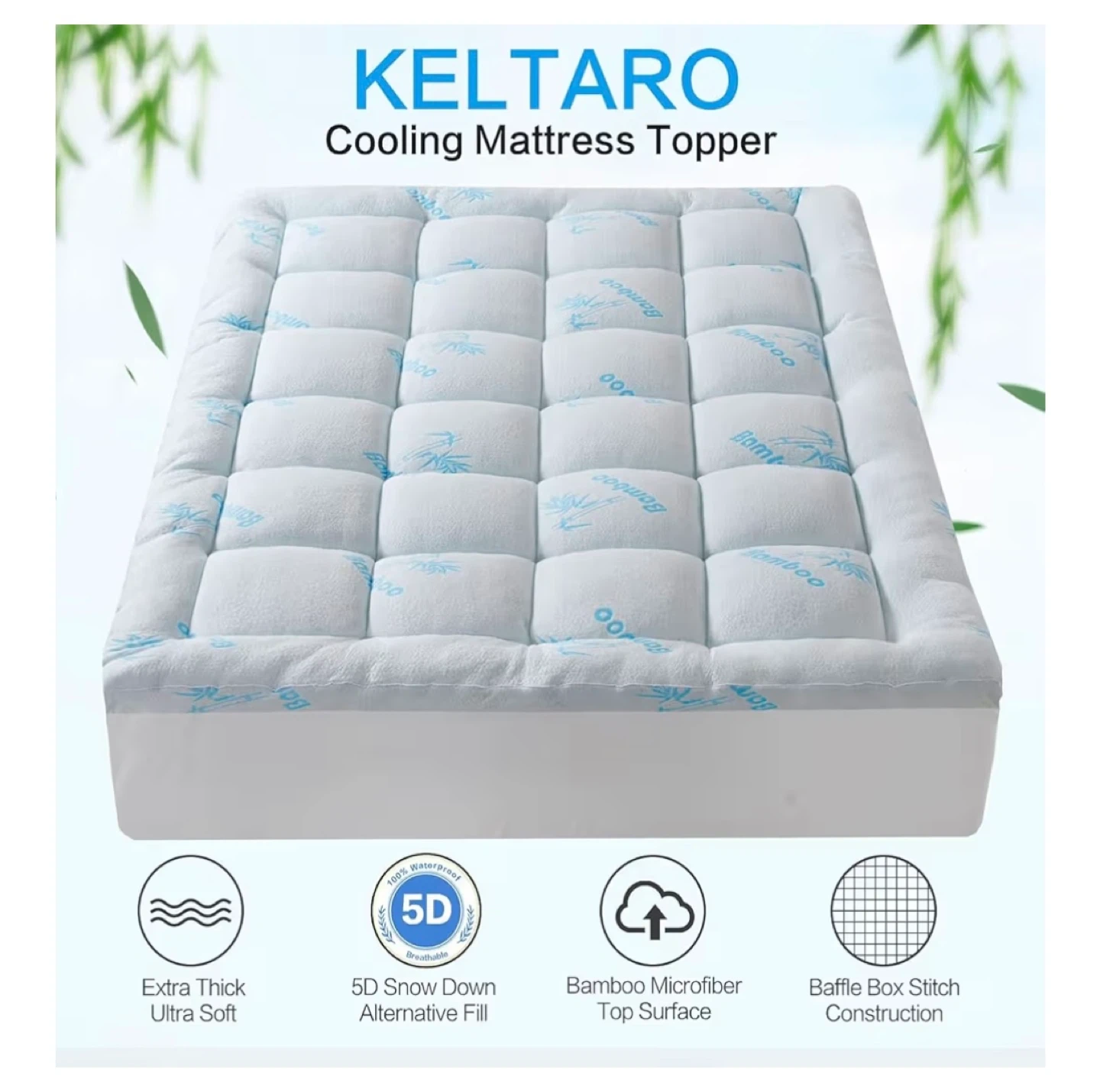 Looking to upgrade your sleep? This KELTARO cooling mattress topper could be just what you need! It features a bamboo microfiber top surface and 5D snow down alternative fill for extra thick, ultra-soft comfort. The baffle box stitch construction ensures even distribution, and it's machine washable for easy care