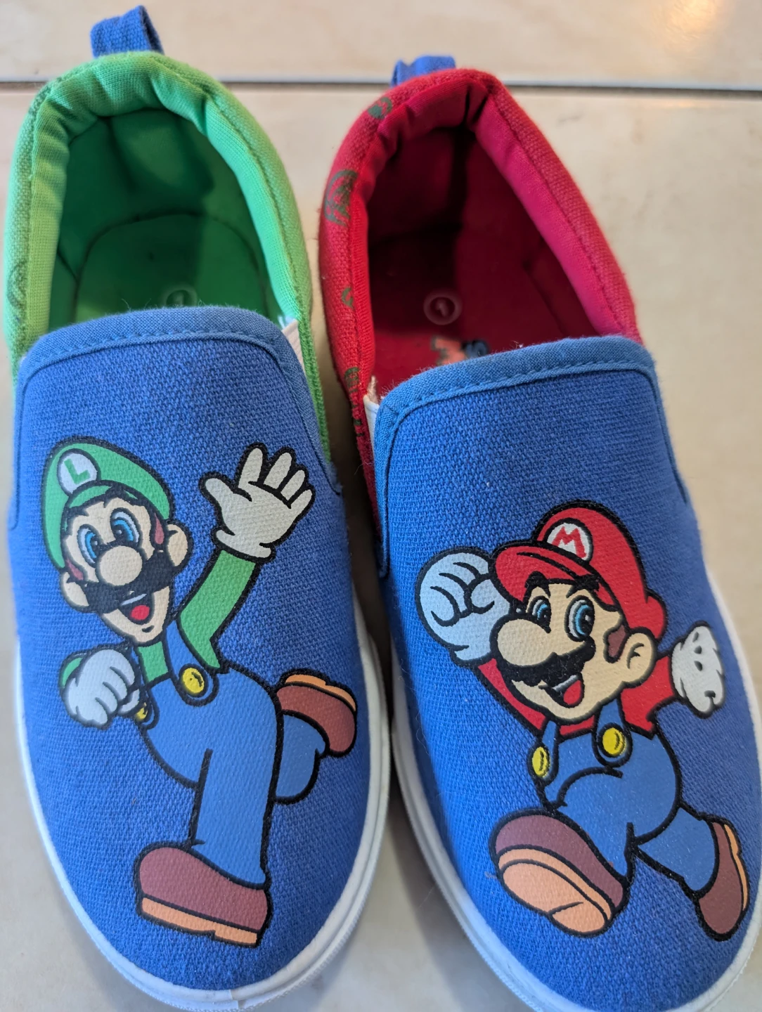 Selling a pair of brand new Cute Super Mario slip-on shoes for kids! These are in size 1 and feature fun designs of Mario and Luigi. Perfect for your little one!