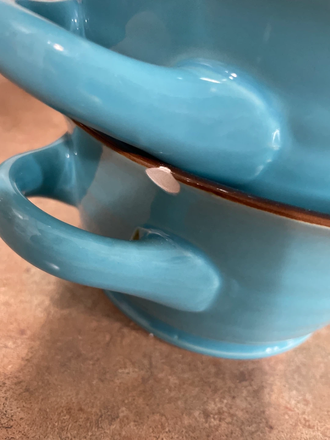 513Selling a set of four soup bowls. They are a lovely blue colour with brown trim. There is a small chip on one of the bowls as pictured.