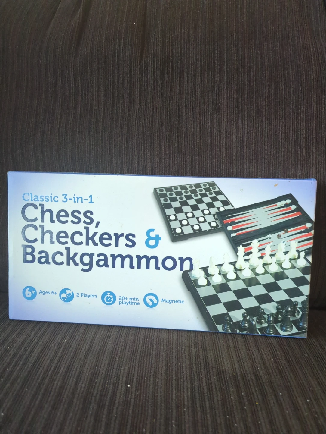 87Get ready for some classic fun with this 3-in-1 game set! It includes Chess, Checkers, and Backgammon. Perfect for ages 6+ and designed for 2 players. Enjoy 20+ minutes of playtime with this magnetic set