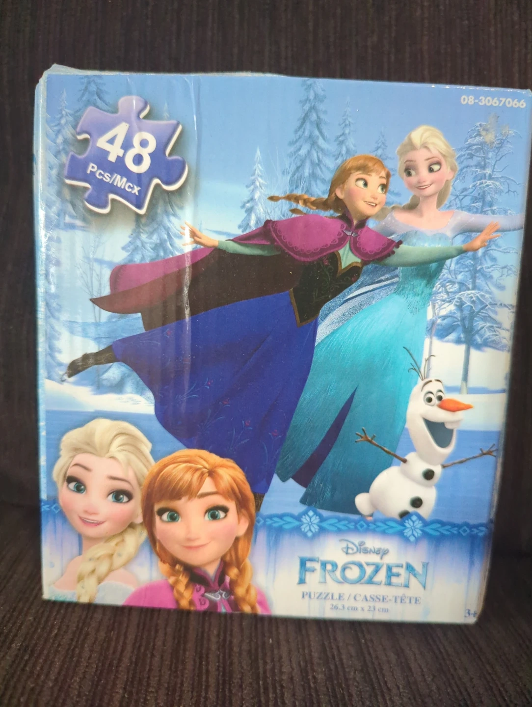 65Selling a Disney Frozen puzzle with 48 pieces! The puzzle box dimensions are 26.3 cm x 2.3 cm, and it's recommended for ages 3 and up. Perfect for Frozen fans!