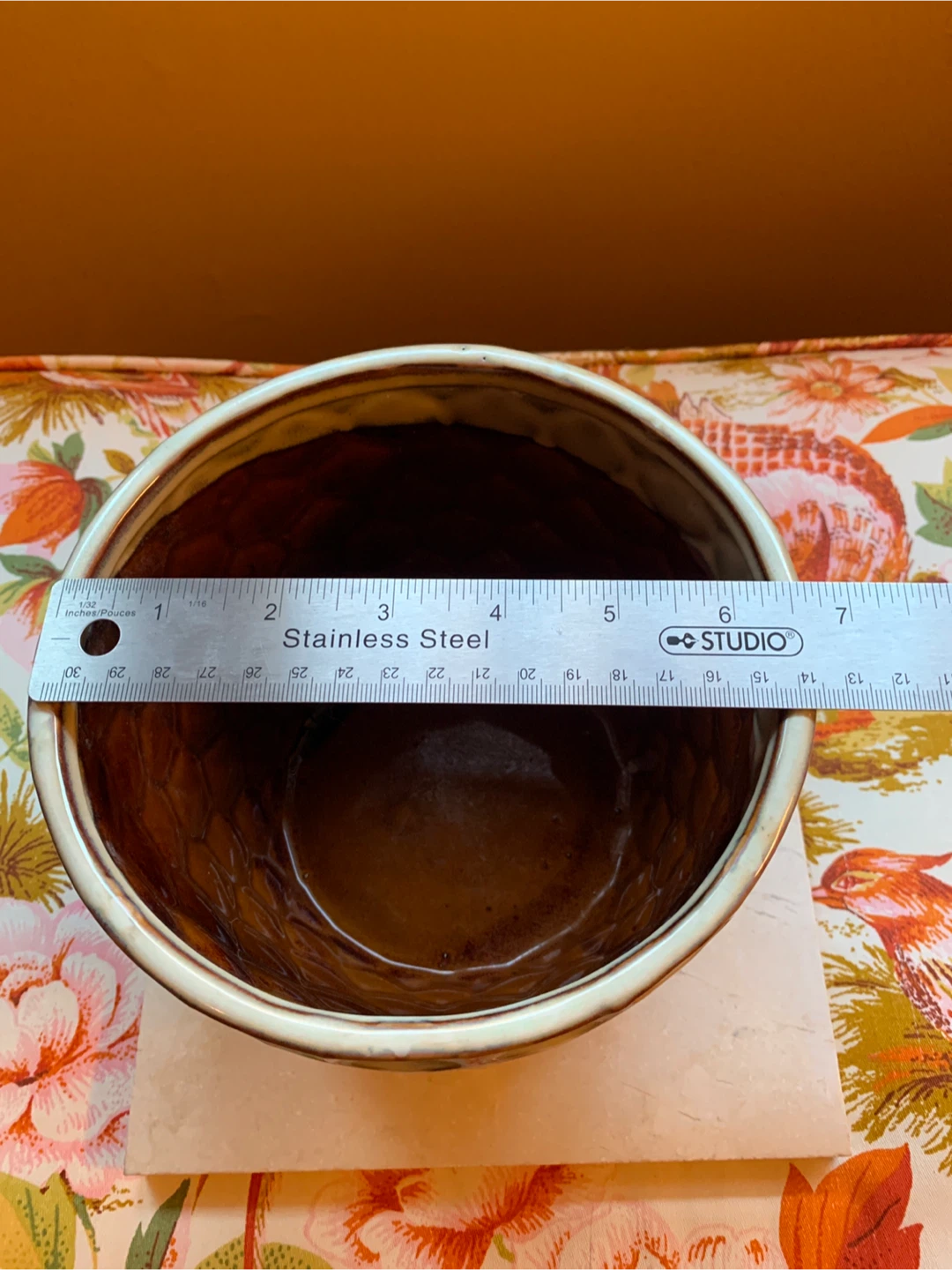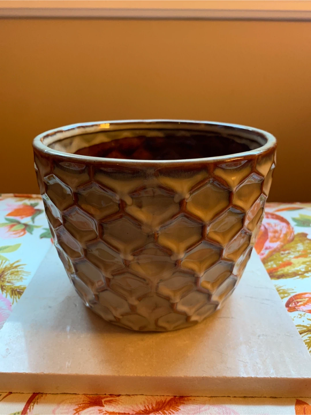 Selling a lovely ceramic planter with a unique honeycomb pattern and drip glaze. It's in great condition with no cracks or chips and would look great with any plant! The planter is brown and cream coloured and is made in China. It’s a really unique pattern and a colour palette that would go in everyone’s home!