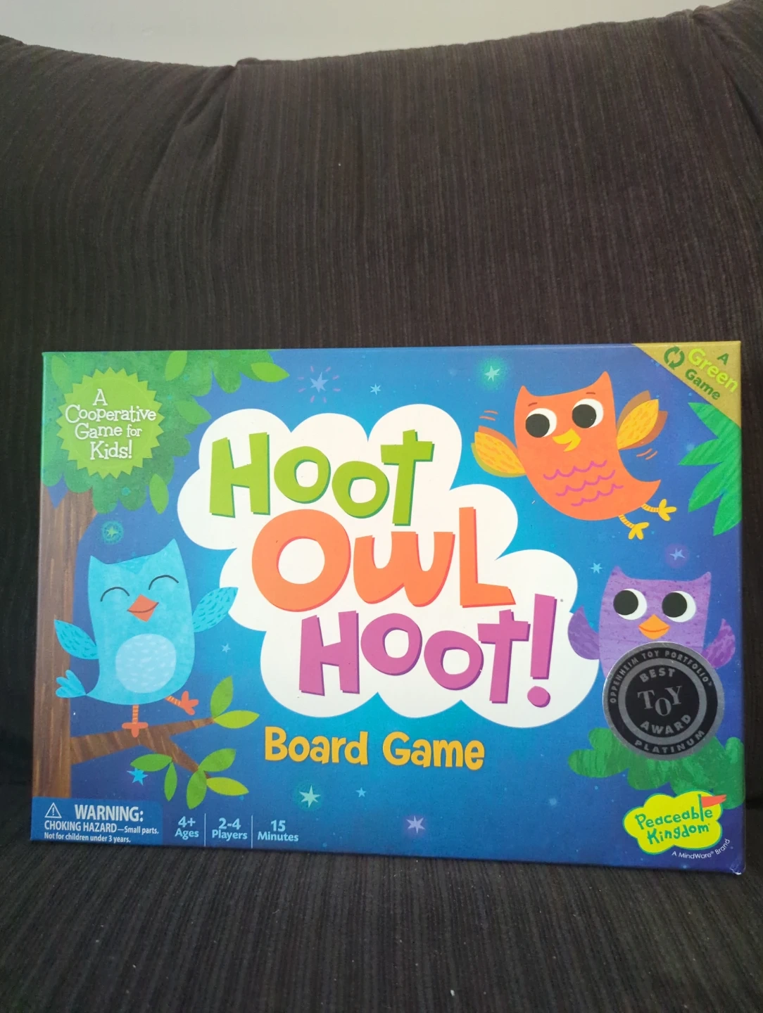 76Brand: Peaceable Kingdom Material: Cardboard Theme: Animals (Owls) Genre: Color Matching Game Number of players: 4 Product Dimensions: 22.9L x 33W Centimetres HURRY LITTLE OWLS: In this color coordinated matching game, players cooperate to help the owls fly back to their nest before the sun comes up. Help all the owls home before sunrise and everyone wins! LEARNING AND GROWING: Kids learn simple strategy, following directions & taking turns. Two levels of play allow the game to grow with your child and lets older kids play with younger ones too. BENEFITS: Cooperative games cultivate emotional development, shared decision making, positive self esteem, creative problem solving, and develop a sense of community in a non-stressful play environment. HOW TO PLAY: Play a color card and fly to that space. Draw a sun card and you're one step closer to daylight. Players can move any owl on their turn and talk together about how to get owls home & win. WHO CAN PLAY: 2-4 Players. Recommended for Ages 4-8. Game includes 1 game board, 6 owl tokens, 1 sun token, 14 sun cards, 36 color cards and instructions for two versions of game play An award winning color-coded cooperative matching game with two play levels so it will grow with your child Players work together to help the owls fly back to their nest before the sun comes up; if they are successful everyone wins! Children learn simple strategy and social development skills with no reading required Winner of seven awards including Oppenheim Toy Portfolio Platinum Award and Dr. Toy Best Green Product Award For 2 to 4 players ages 4 years and older; Peaceable Kingdom packaging is all designed to be frustration free - naturally!