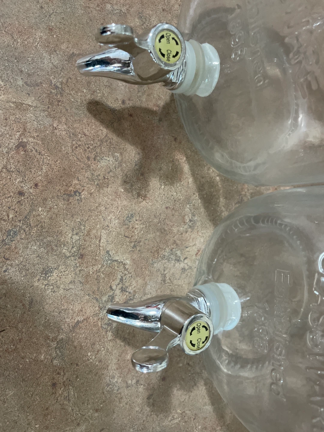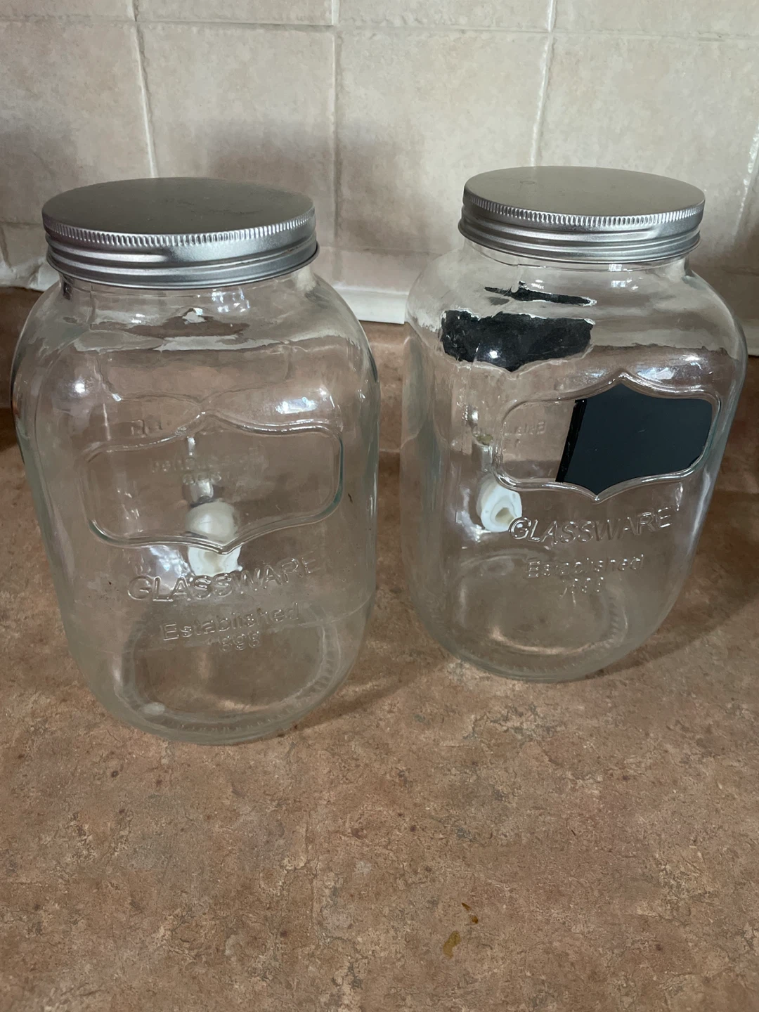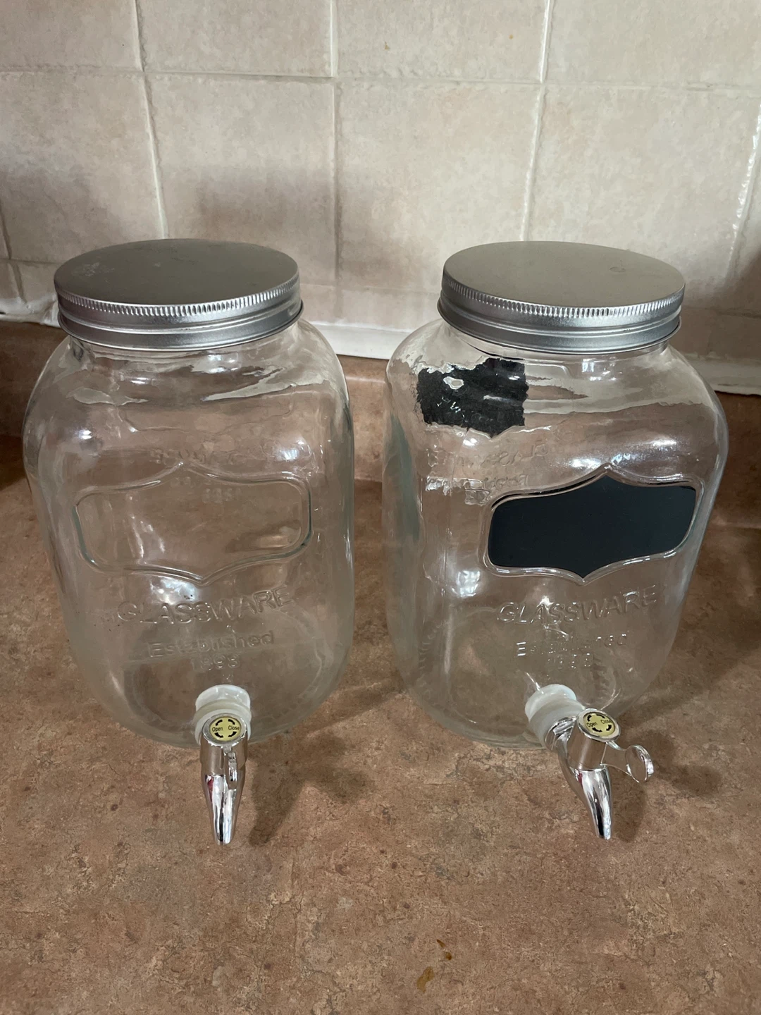 Two Glassware beverage dispenser jars with spigots.