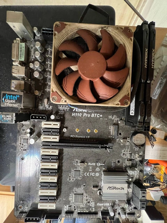 * Asrock H110 Pro BTC+ Mining Motherboard with CPU, RAM & mining Frame. With box. Works fine. $60 * Gigabyte GA-H110-D3A with CPU (Not sure if Celeron or i3) & Cooler. $40 * Intel Pentium G440T 2.9GHz with CPU Cooler. $10 * Arctic 120mm case fans. Model: ARCTIC P12 PWM PST. 5 Pack x2. $35 for all 10. * UpHere 120mm Case fans. 6 available. $20 for all 6. * Ryzen 5 3600x Wrath Prism stock CPU cooler with CPU box. Unused. $10 Feel free to make an offer for multiple items. Available if this ad is up. No need to ask if still available.