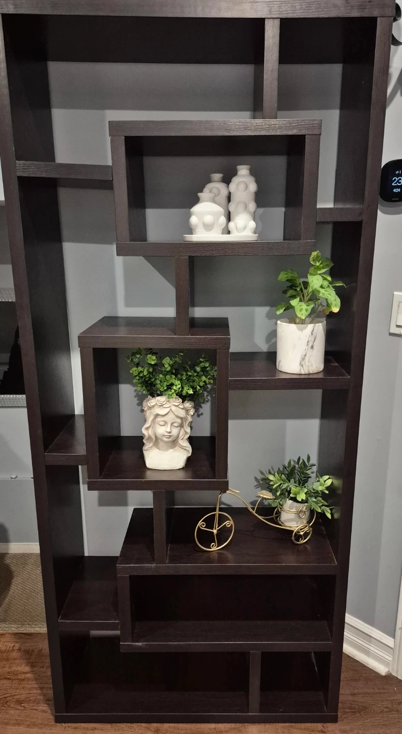 Selling a dark brown bookshelf with a unique geometric design. It's a great piece to add some visual interest to your space and provides ample storage for books and decor.