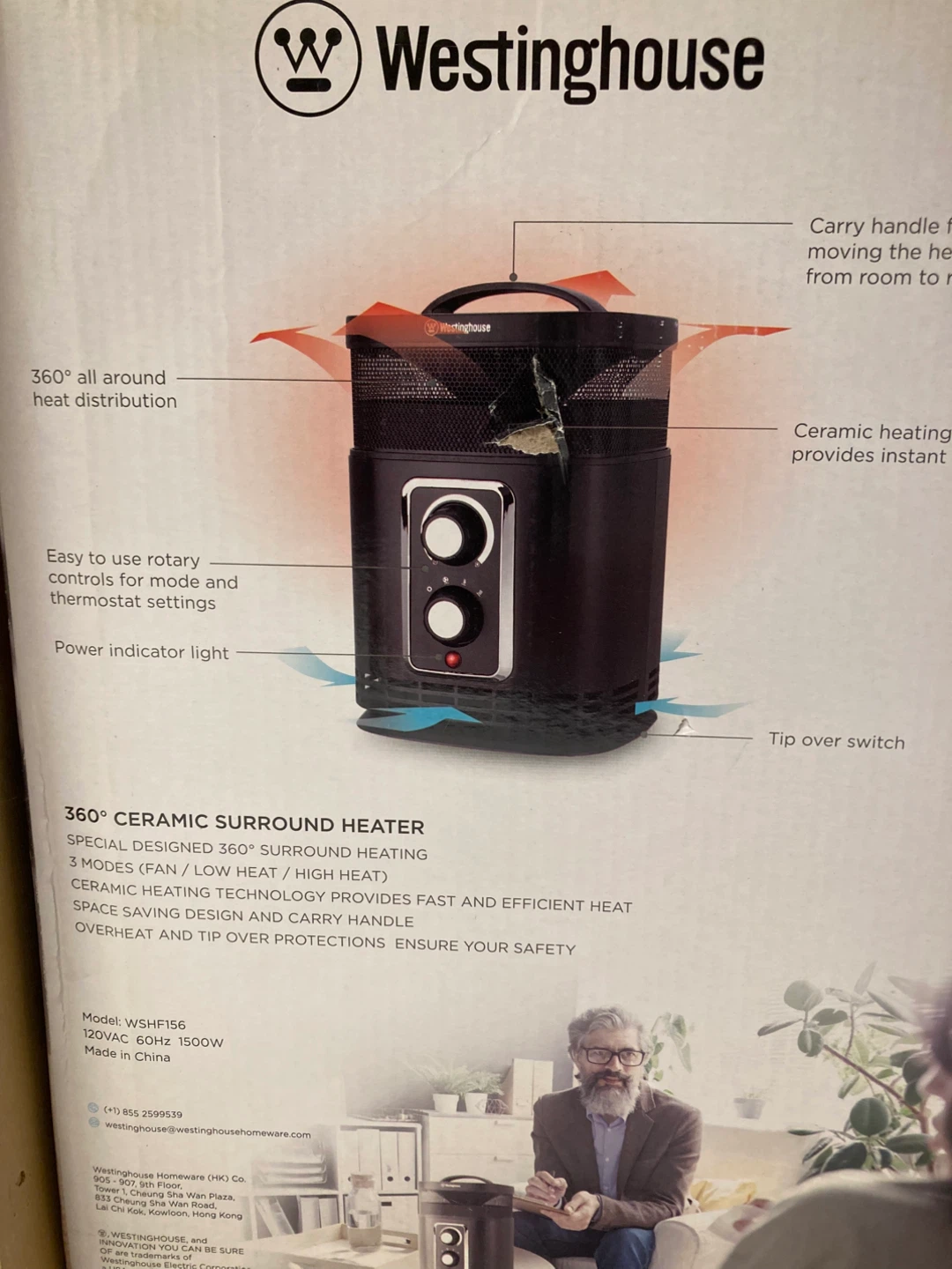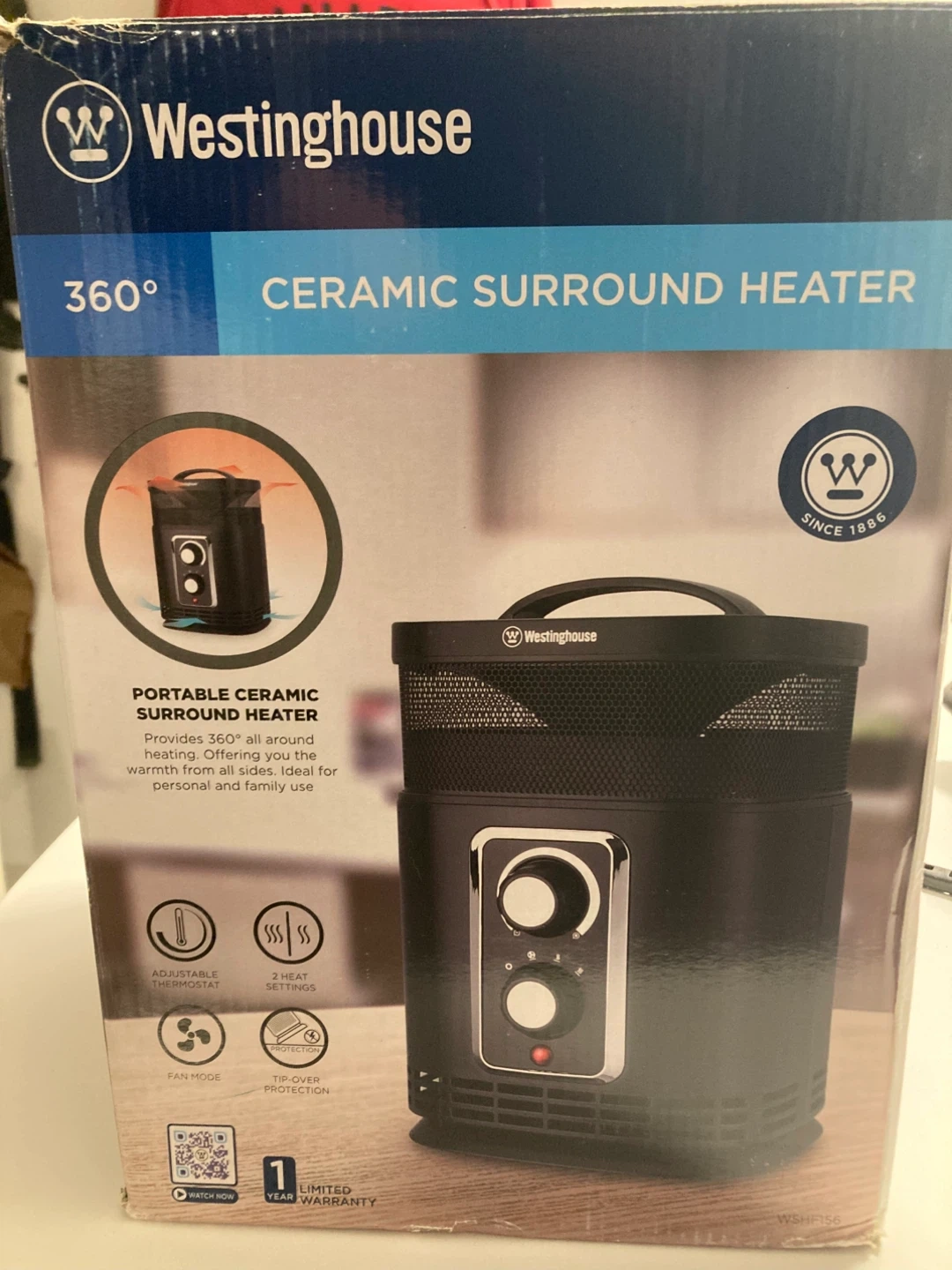 Selling a Westinghouse 360° ceramic surround heater! It's a portable heater that provides 360° surround heating, perfect for personal and family use. It has adjustable thermostat and 2 heat settings. The heater also features tip-over protection for safety. Comes with the original box!