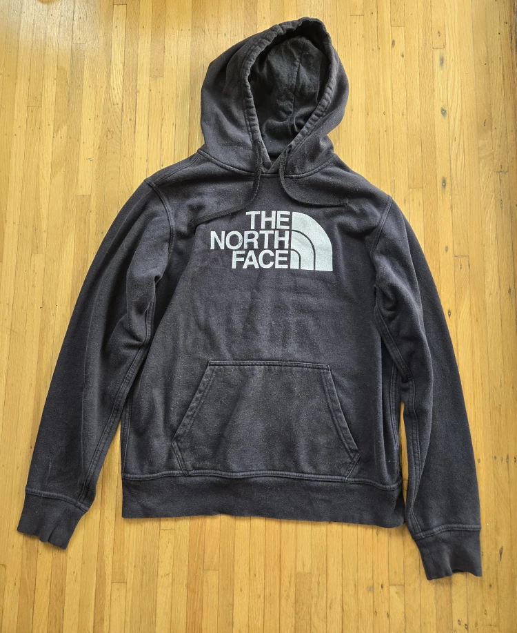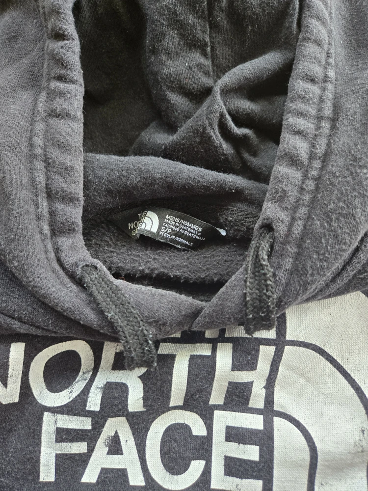 Mens black hoodie from The North Face. Drawstring hood. Light fading and pilling.