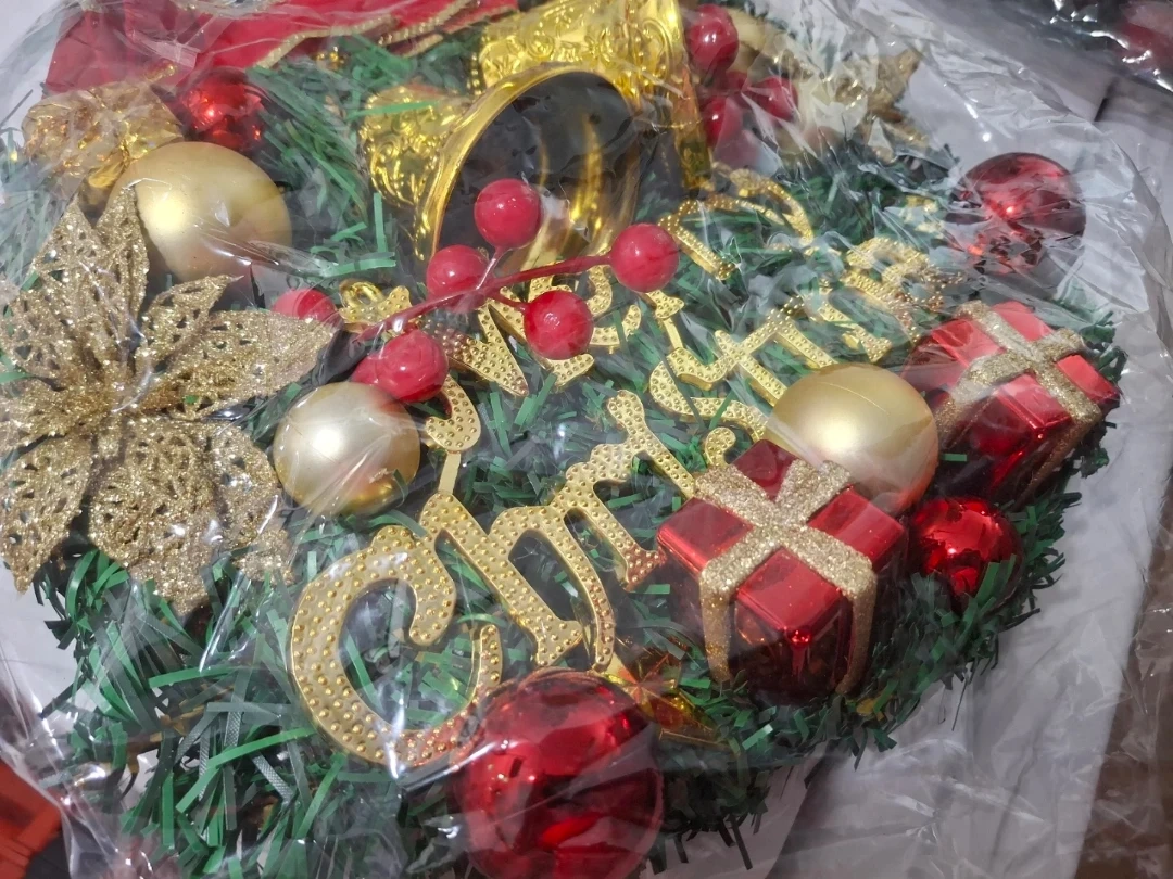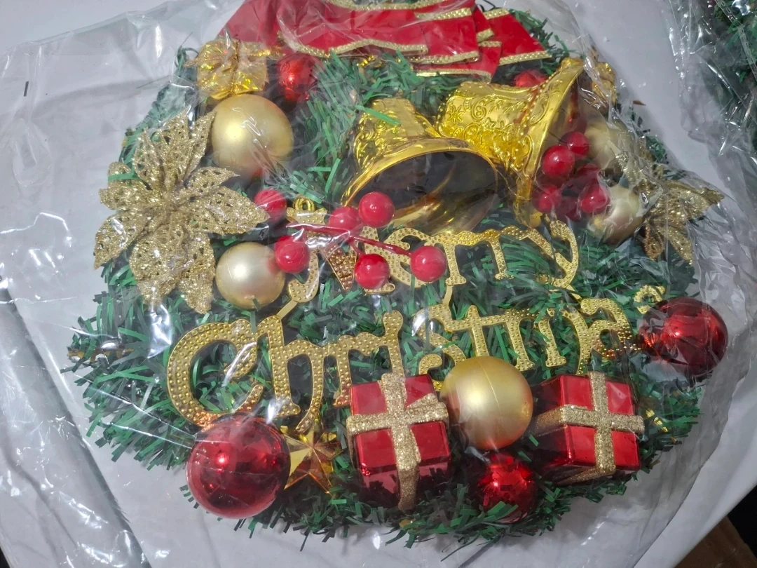 1000+Selling a festive Christmas wreath! It's decorated with gold bells, red and gold ornaments, and little gift boxes. Perfect for adding some holiday cheer to your home 11" diameter New