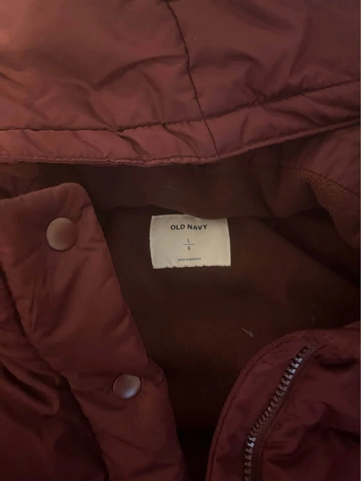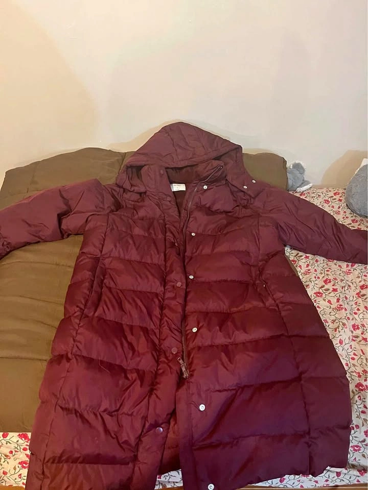 Long puffer jacket from Old Navy, size Large. It’s filled with warm down insulation and still does an amazing job keeping you cozy through the colder winter days. The jacket is water-resistant, has a hood, and comes in a deep maroon color that goes with everything.