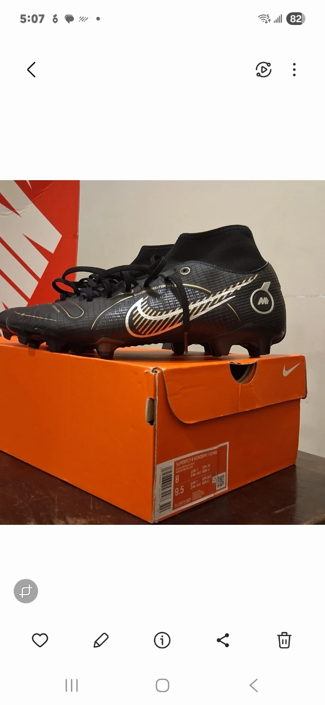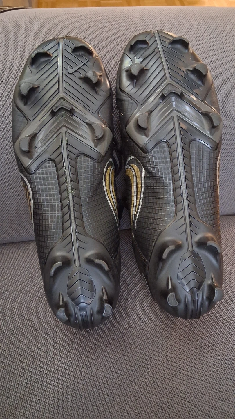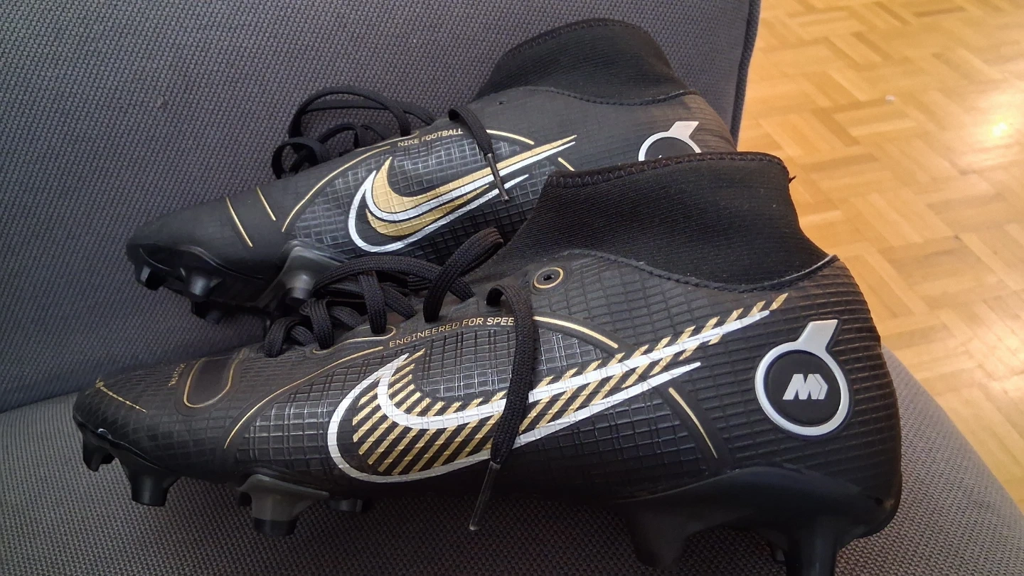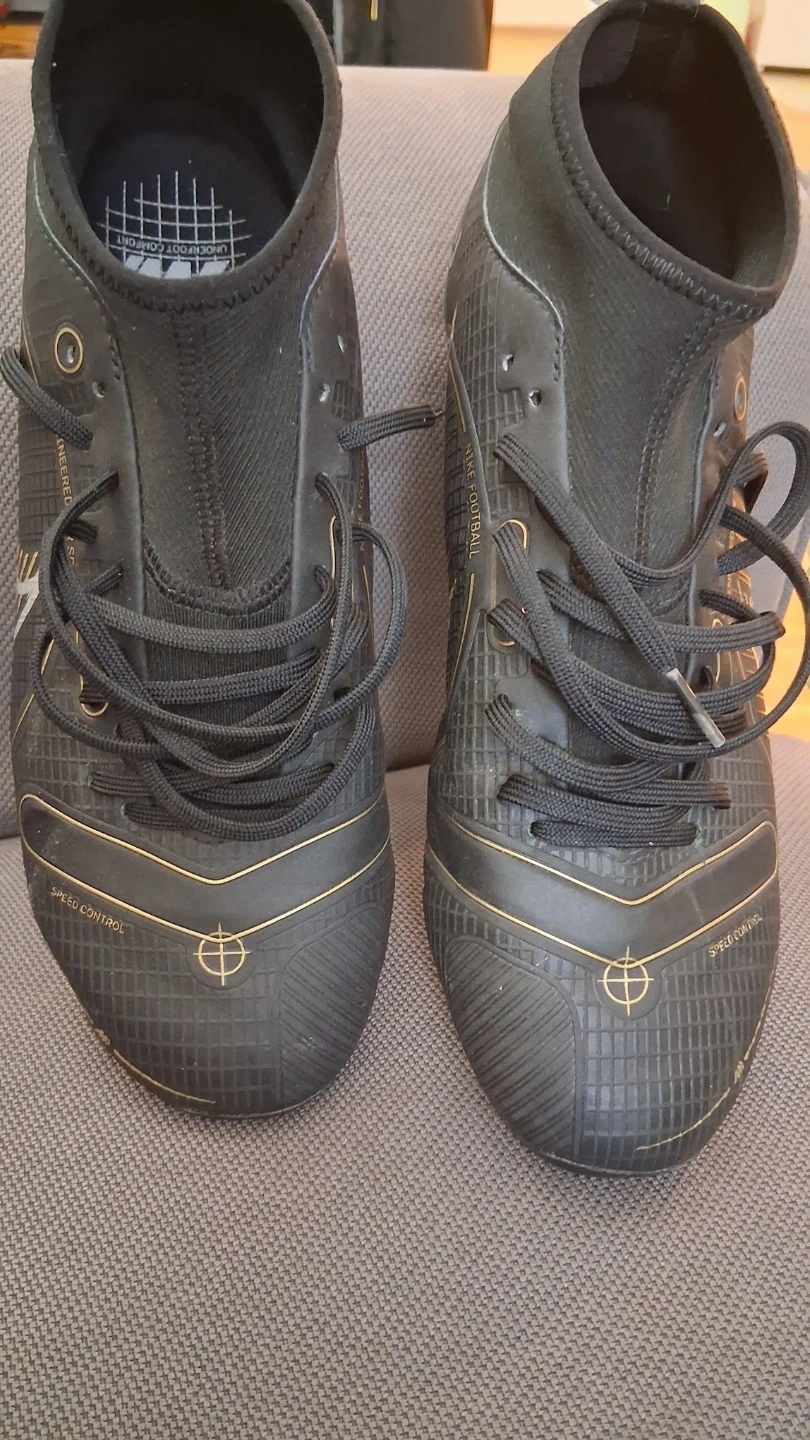 Selling a pair of Nike Mercurial Superfly 8 Academy FG/MG soccer cleats in size US 8. They are black with gold and white accents. These cleats are designed for speed and control on the field. Perfect for your next soccer game! We use it only 1time for one game in door it is new bought it from sport check