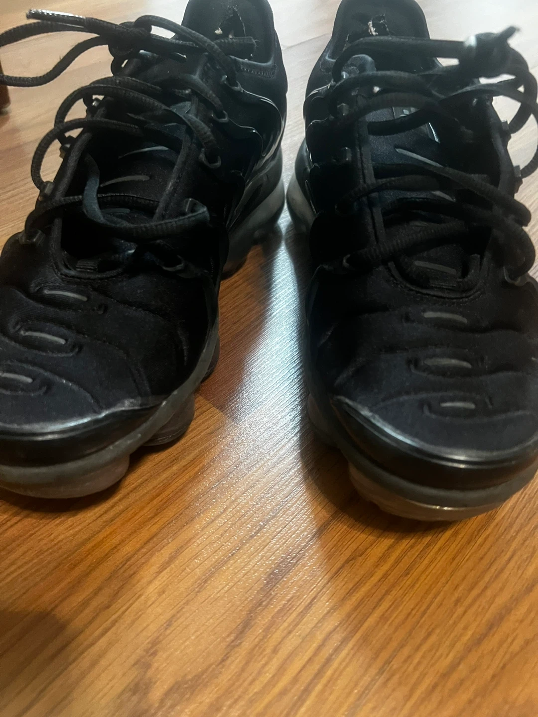 Selling a pair of Nike Air VaporMax Plus in black, size 6.5 US. They're in used condition, as shown in the photos. The shoes have the iconic VM Air logo on the back and the VaporMax sole for cushioning