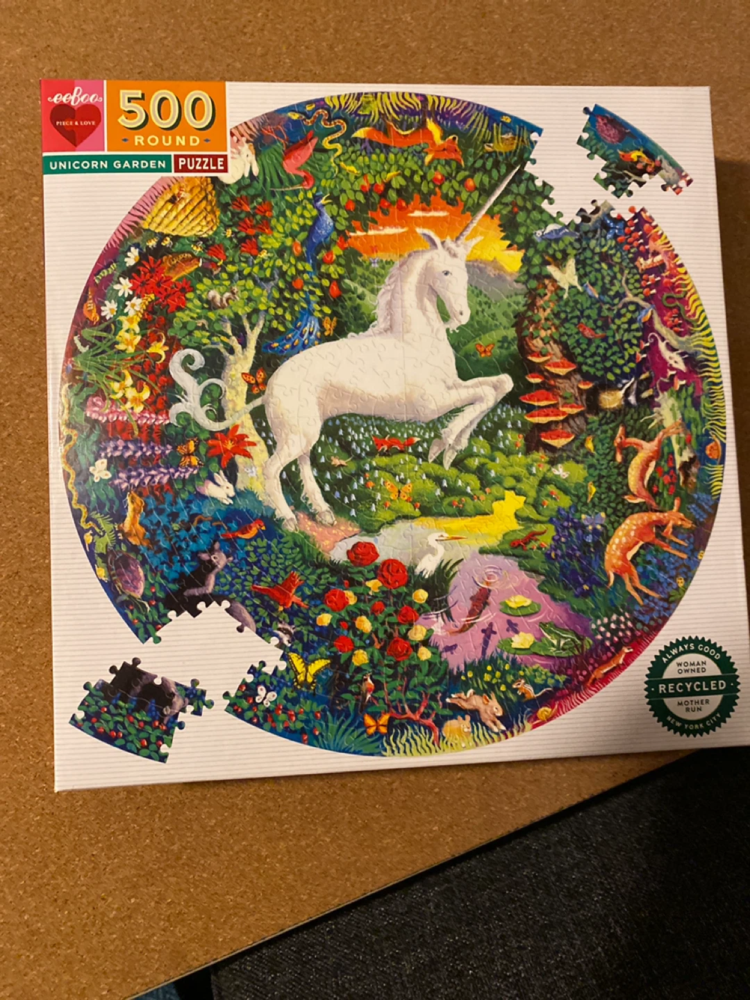 Looking to sell this eeBoo Unicorn Garden 500-piece round puzzle! It's a lovely, colourful puzzle with a beautiful design. It's also made with recycled materials, which is pretty neat.