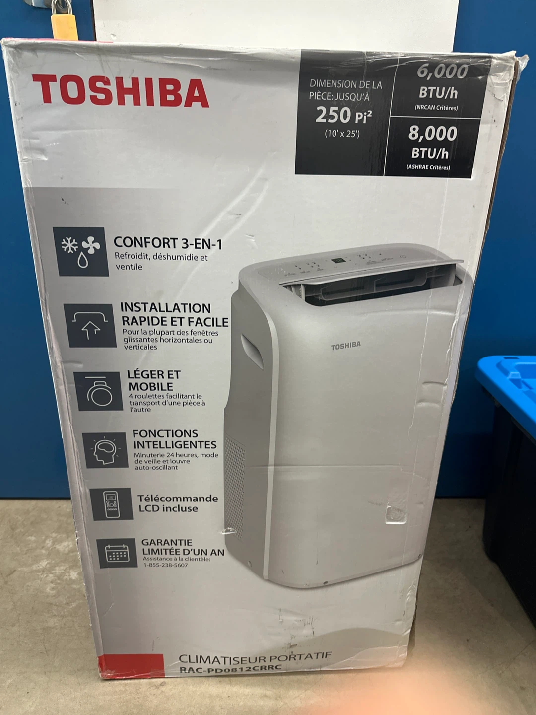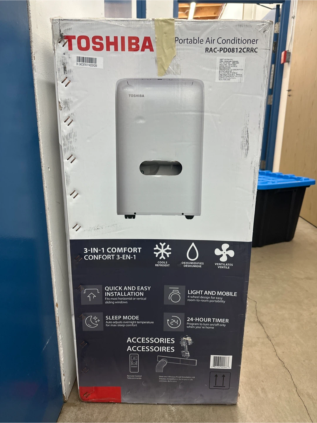 Selling a Toshiba portable air conditioner, model RAC-PD0812CRRC. It's a 3-in-1 comfort unit that cools, dehumidifies, and ventilates. It's designed for quick and easy installation in most sliding windows and is light and mobile with a 4-wheel design for room-to-room portability. It also features a 24-hour timer and includes a remote control. The box is included!