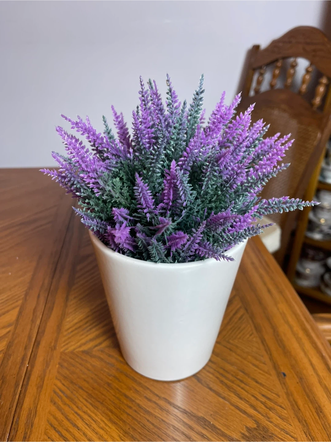 This artificial lavender plant adds a touch of colour to any room! It comes in a simple white pot and is in great condition. Made in USA.