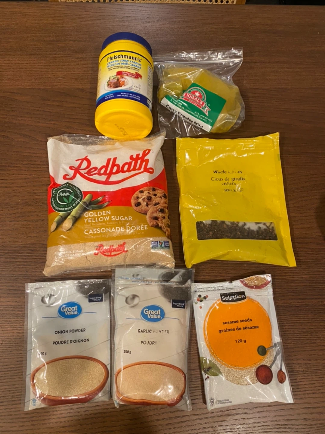 Left overs from going over the pantry and refilling the containers. Brand new bag of brown sugar, onion powder, sesame seeds, and garlic powder. Half a bag/container of whole cloves, curry powder, and corn starch. Looking to give all away together