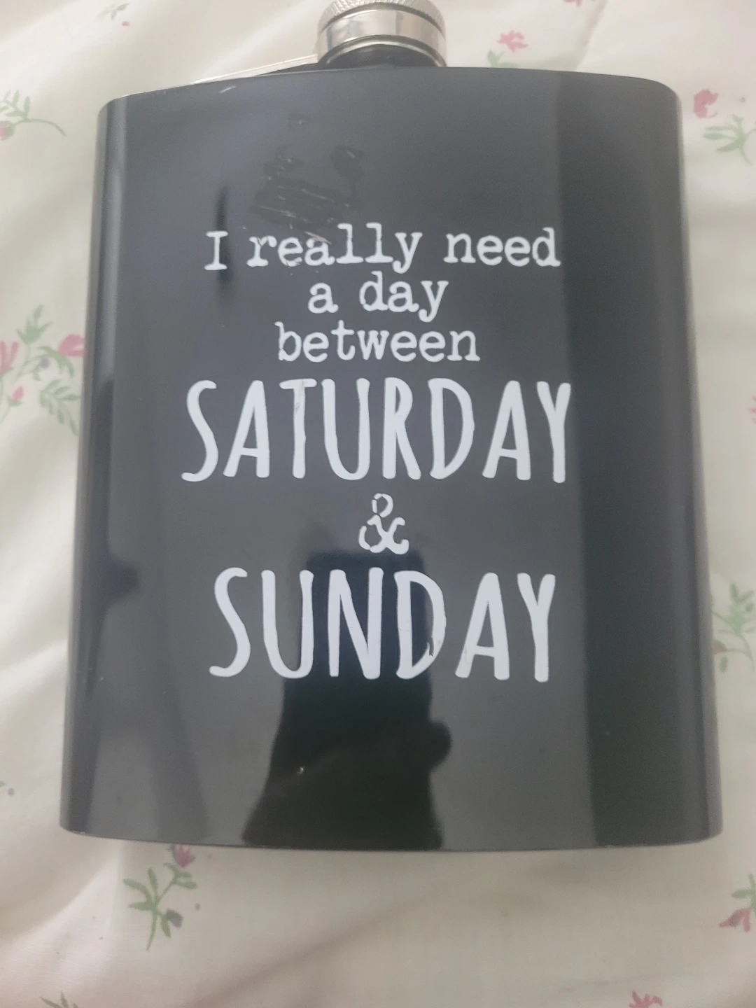 Selling a black flask with the fun saying, 'I really need a day between SATURDAY & SUNDAY' printed on it! It's in great shape and ready for a new home