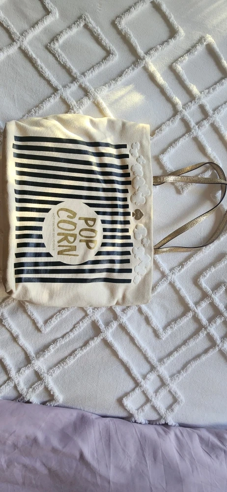 This is a Kate Spade tote bag with a fun popcorn design! It's perfect for carrying your everyday essentials. The bag features a black and white striped pattern with a "Pop Corn" graphic on the front. The handles are a shiny gold colour. Inside, there's a handy pocket for keeping things organized