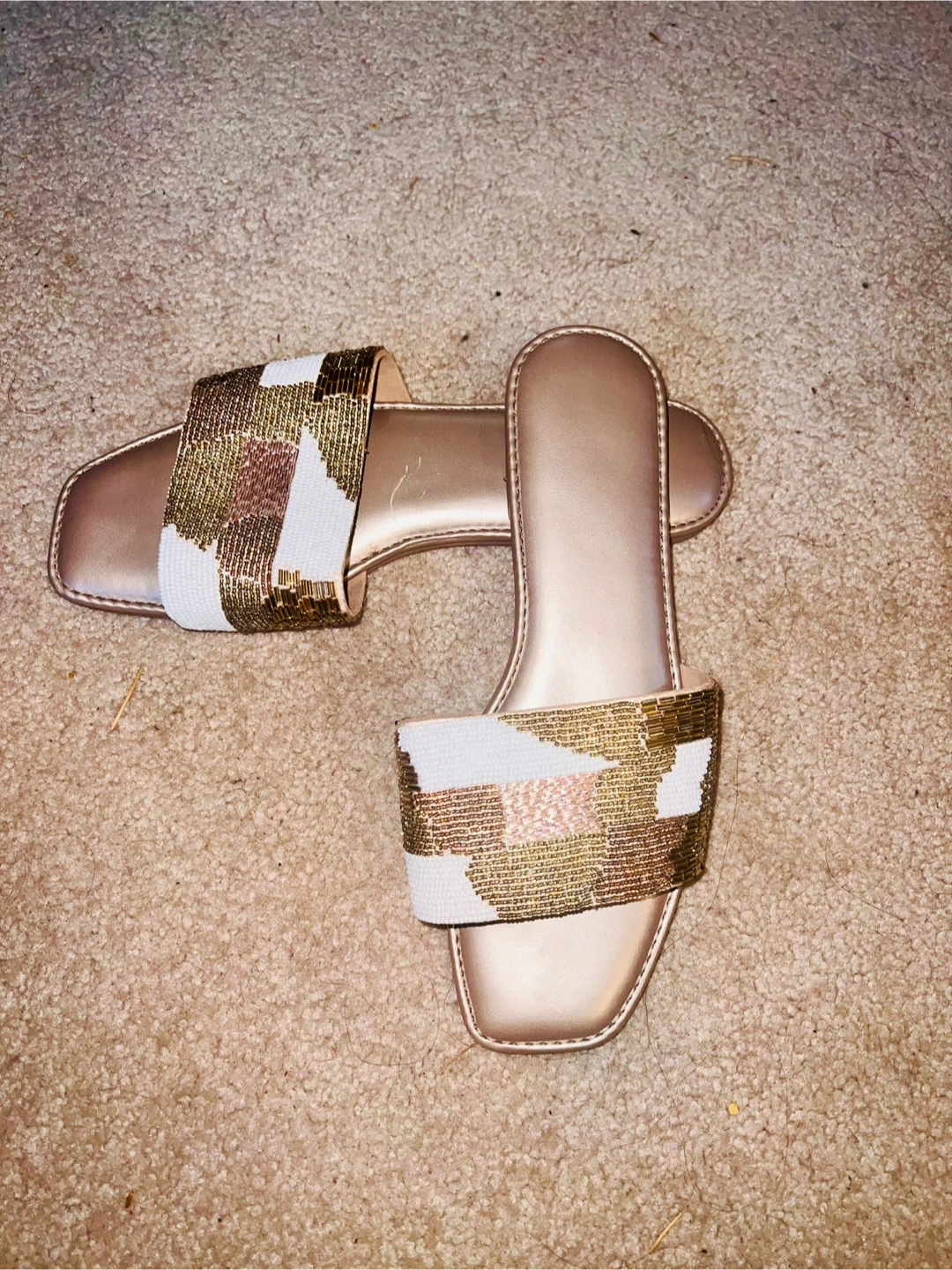 65Cute pair of slide sandals with a beaded design. Perfect for summer!