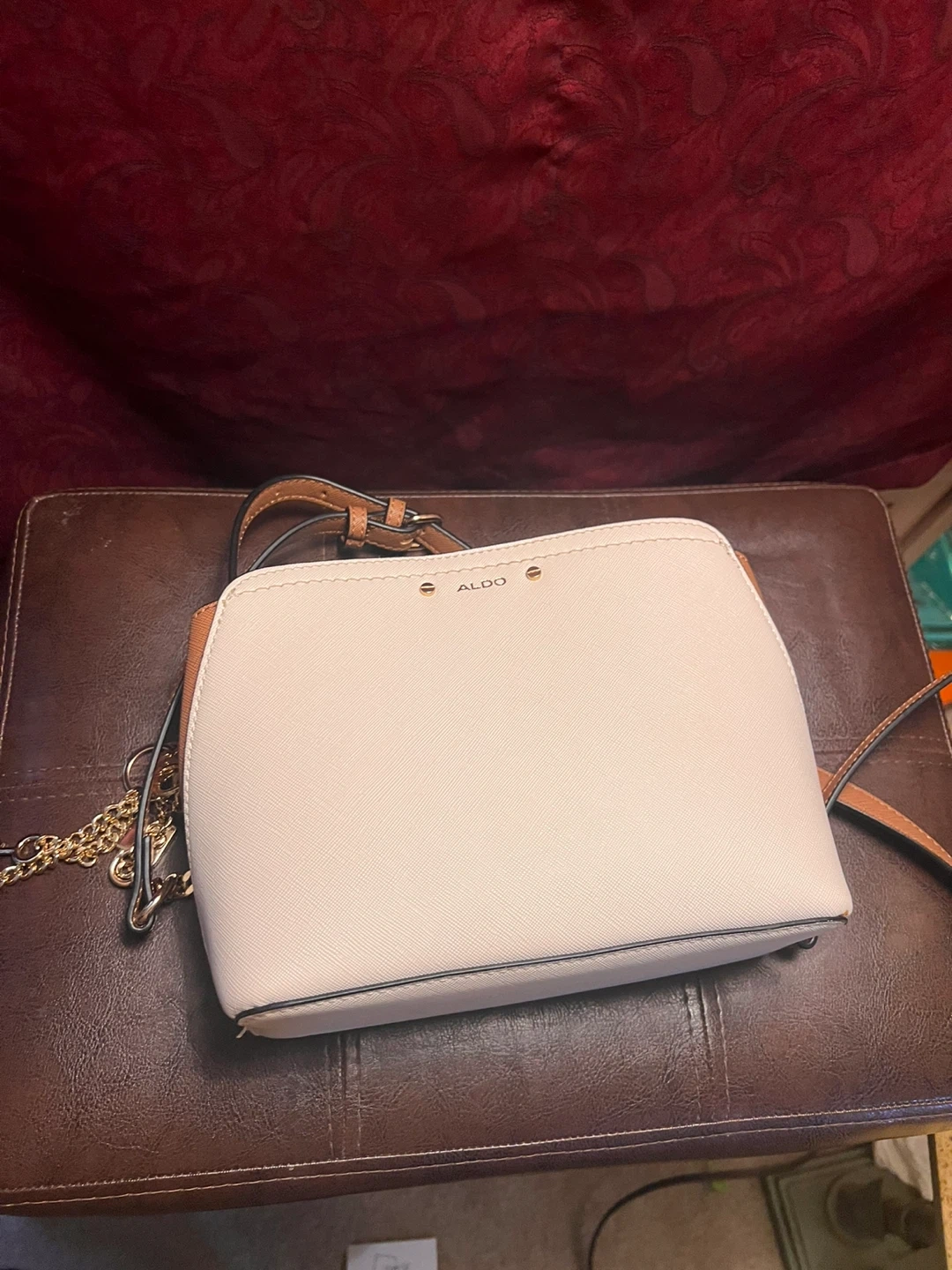 Selling a cute ALDO crossbody bag! It's in great condition and features a mix of white and brown tones with gold chain detailing. Perfect for adding a touch of style to any outfit!