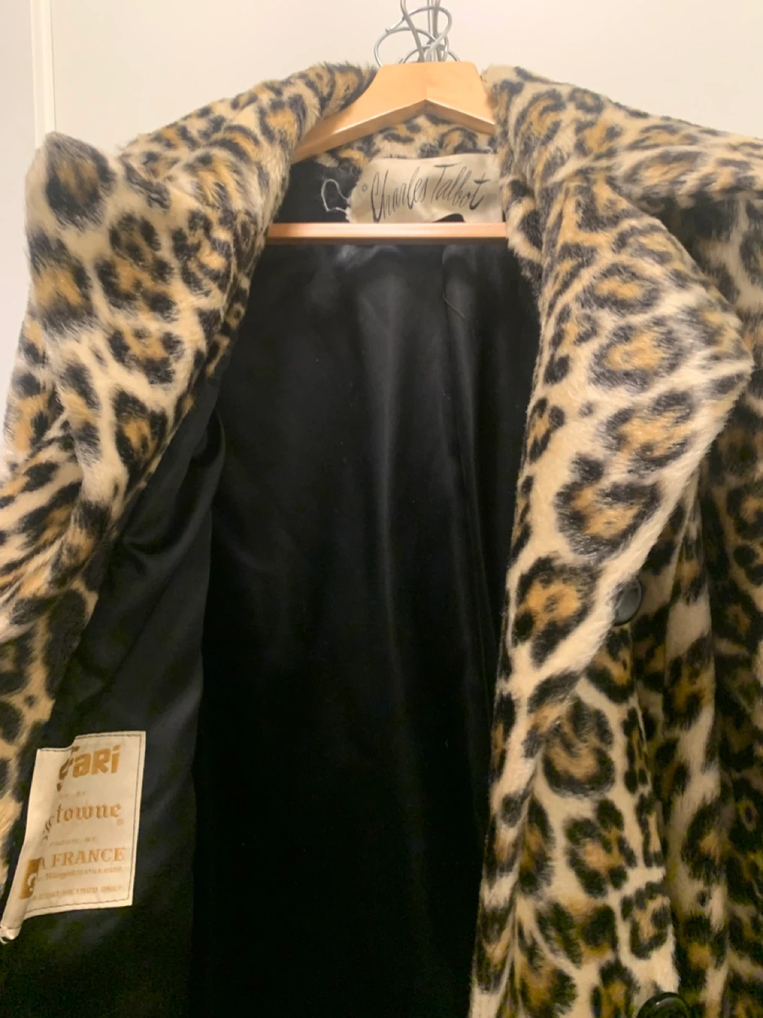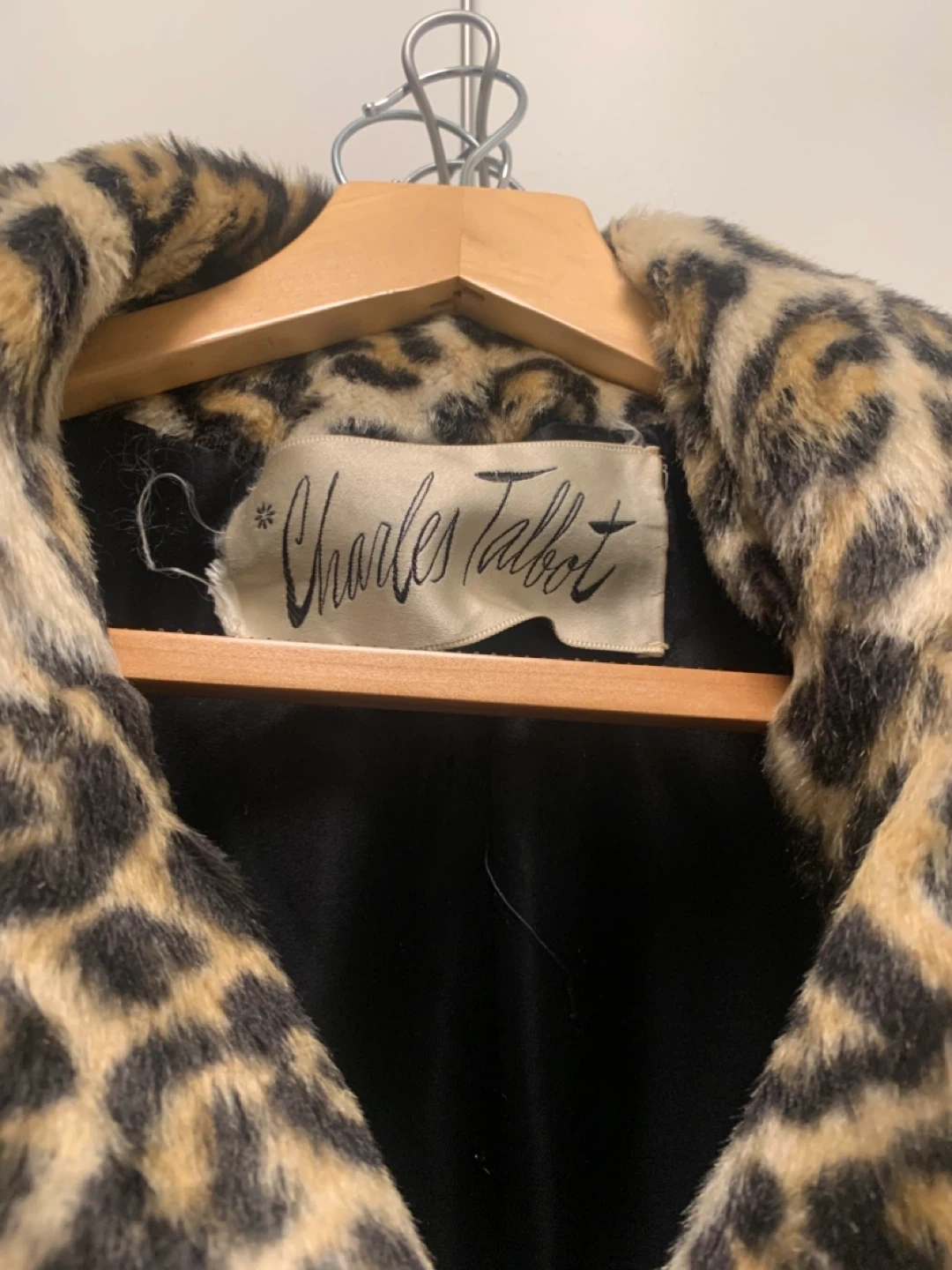 Snuggle up in this stylish Charles Talbot leopard faux fur swing coat with black satin lining!
