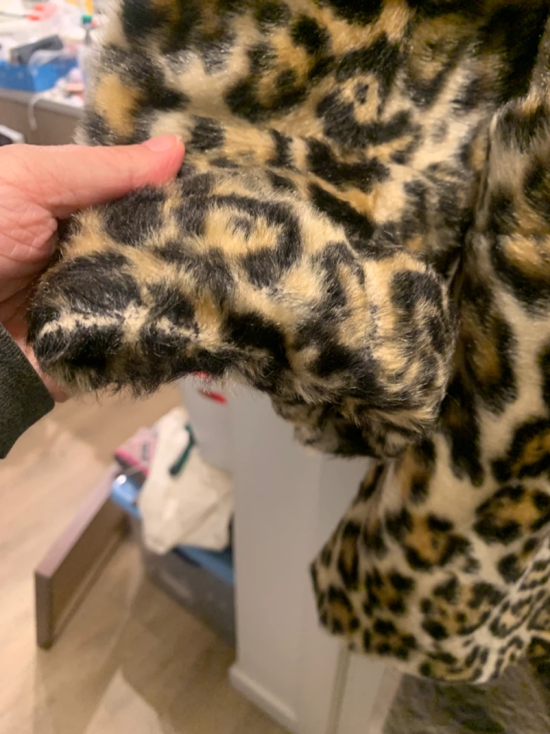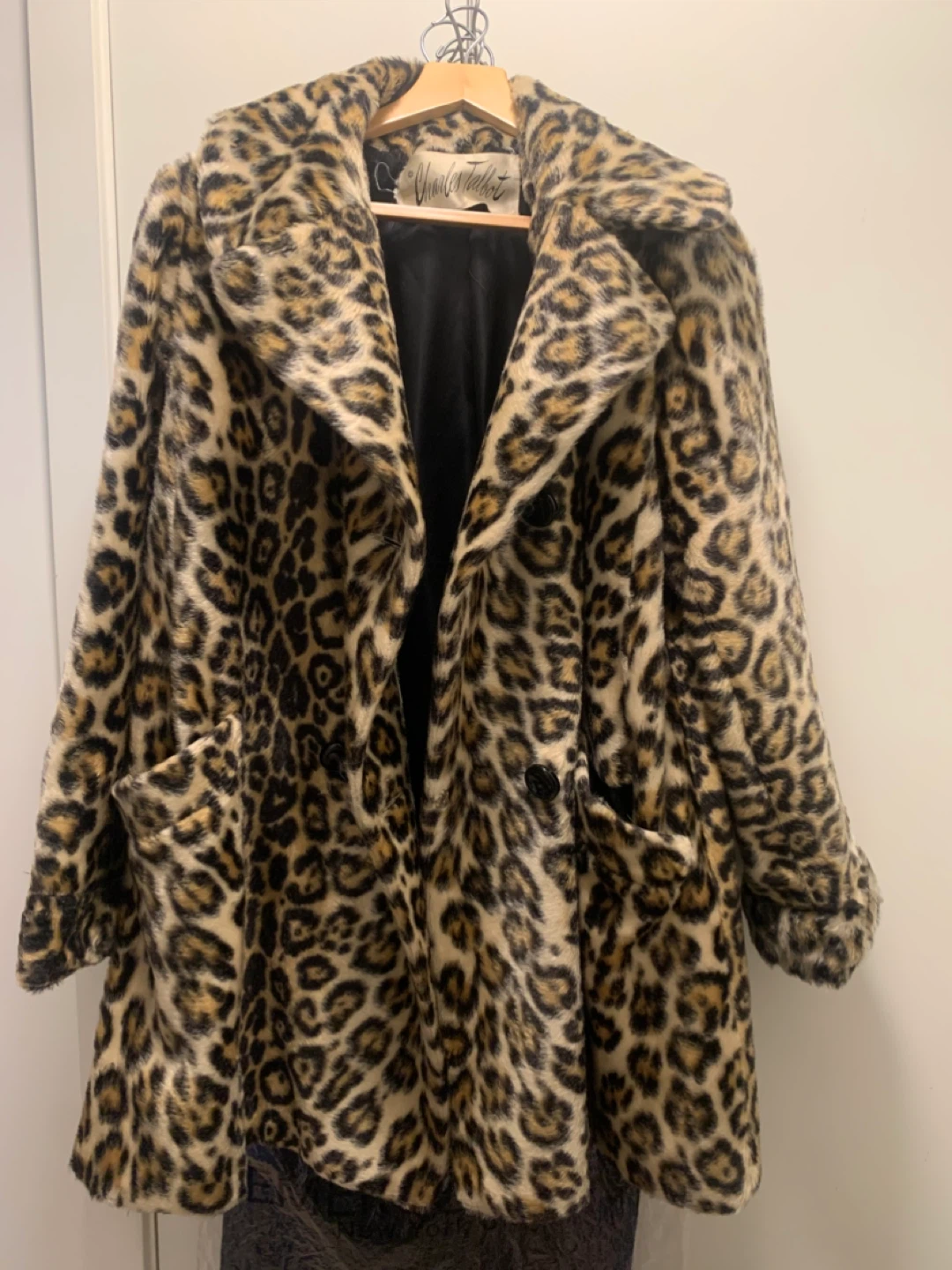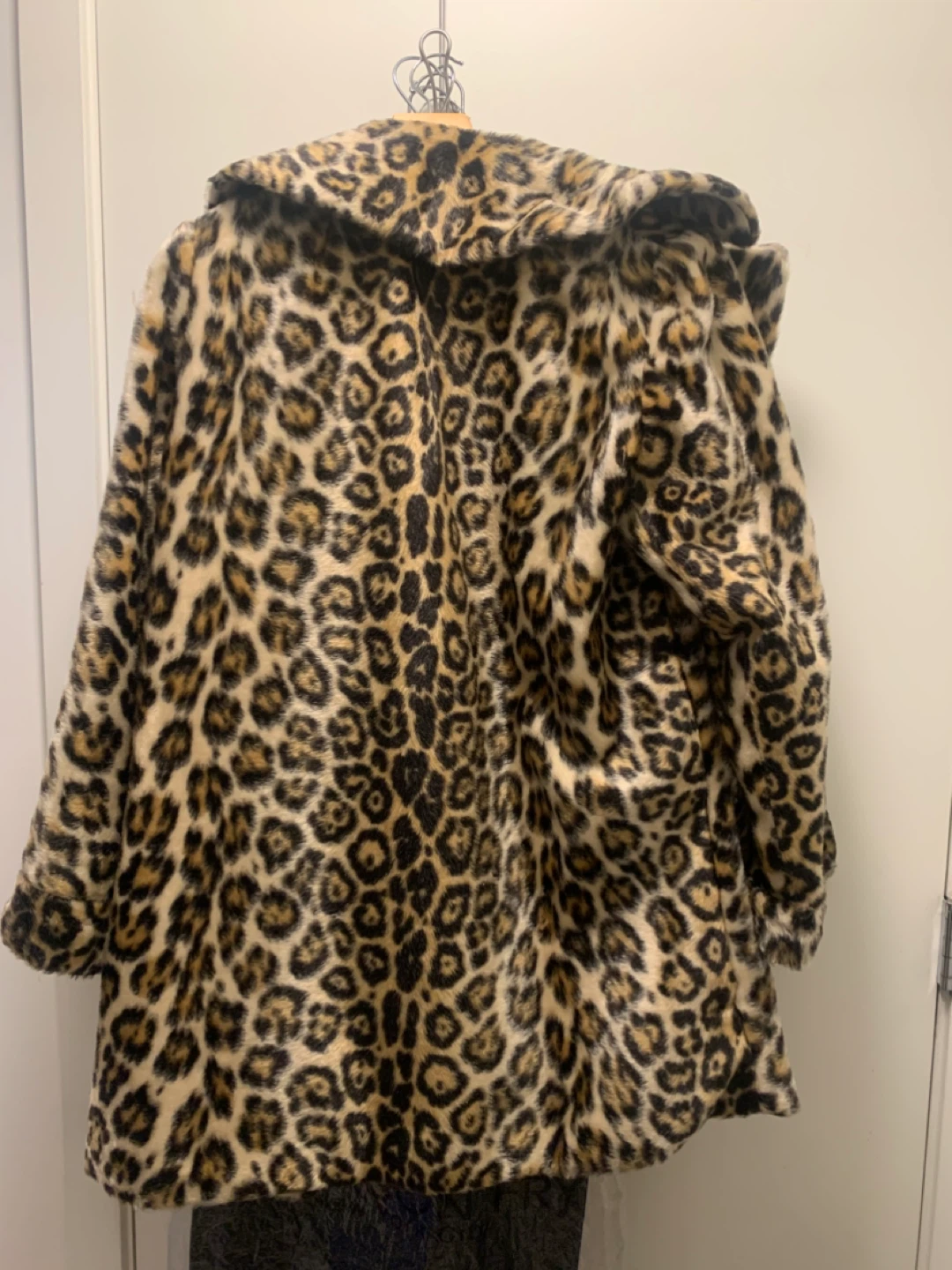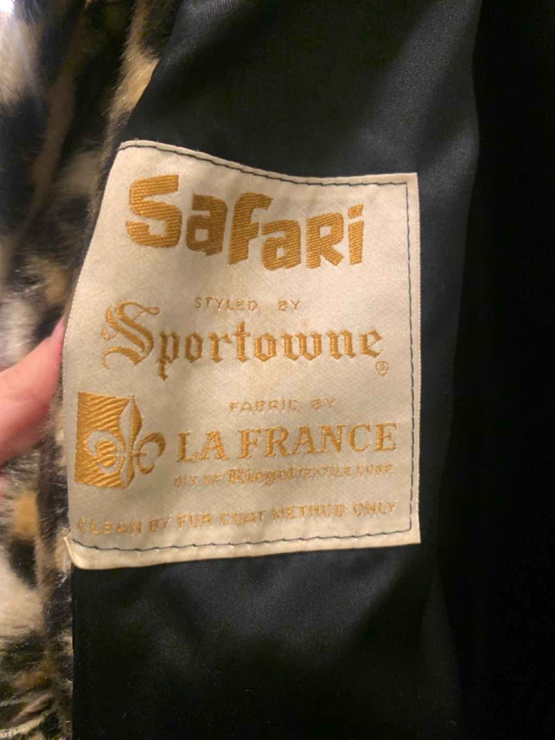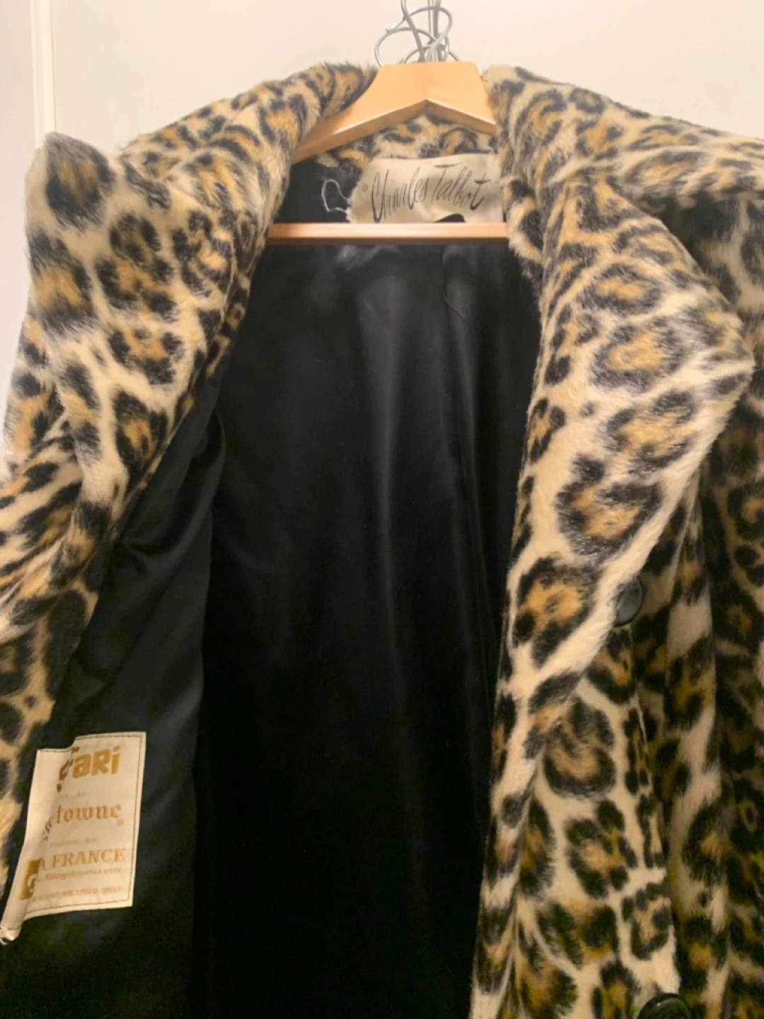 Snuggle up in this stylish Charles Talbot leopard faux fur swing coat with black satin lining! Vintage from the 1960s/1970s… Double breasted swing coat style. Fabric by La France, styled by Sportowne Safari. This coat is sure to turn heads! Some wear on the cuffs & the inside pockets need mending. Otherwise in great shape! Buttons are all there & sewed on tight. 35” L x 22” pit-to-pit Would fit a size L, 12 to 14 or M for an oversized look. Similar coats from Sportowne LaFrance sell for much more but priced reduced because the interior pockets are have tears in the fabric