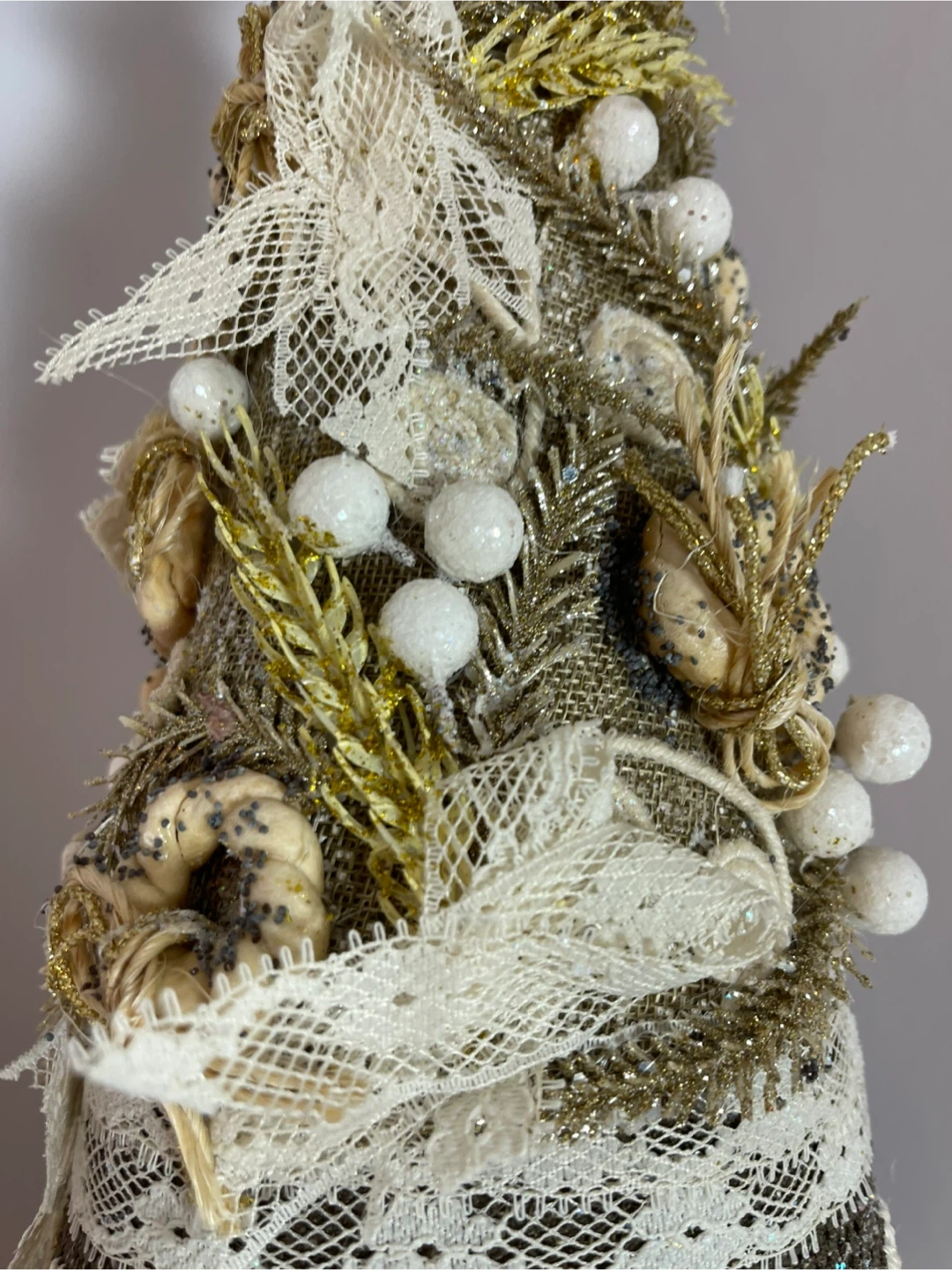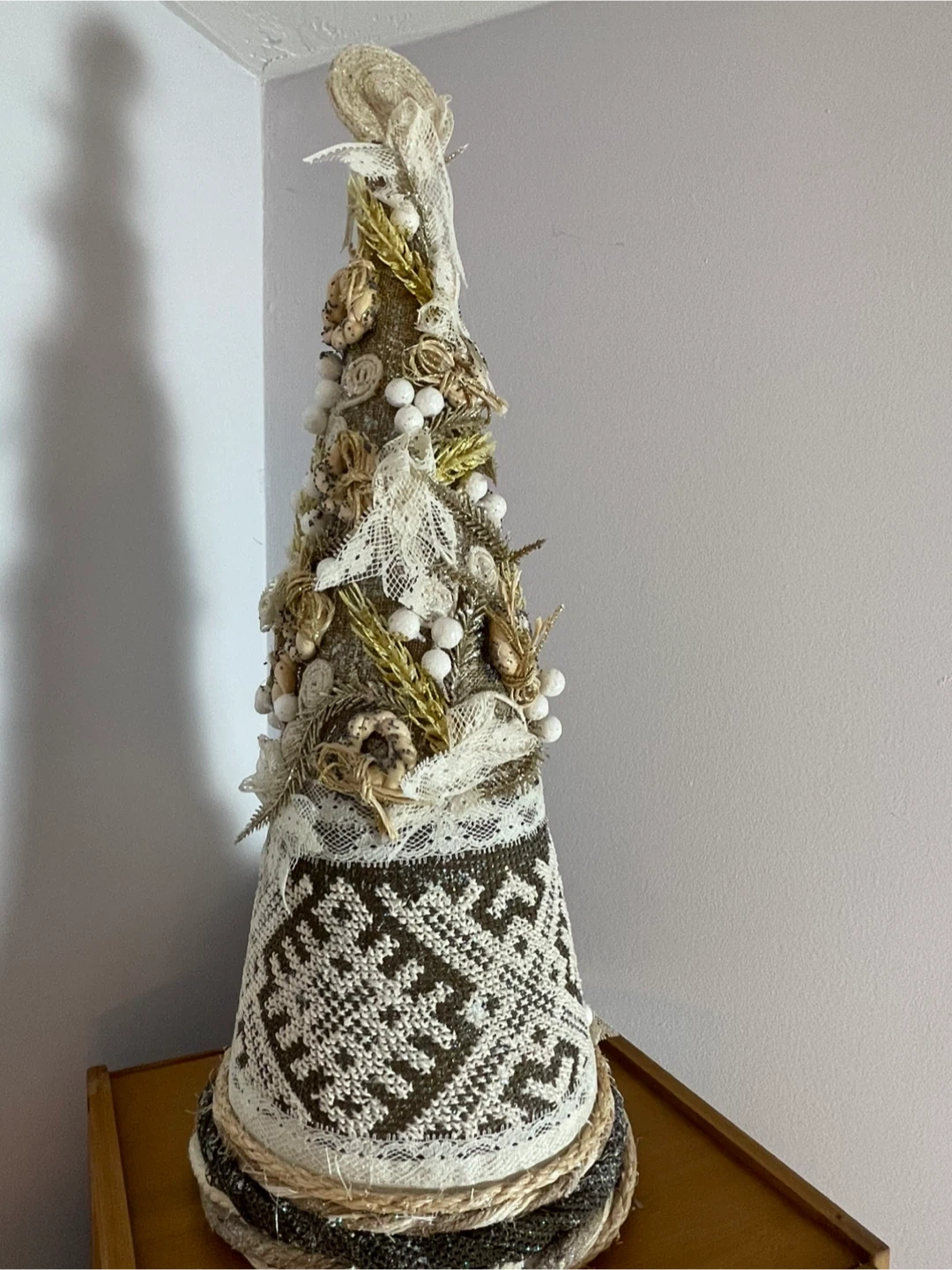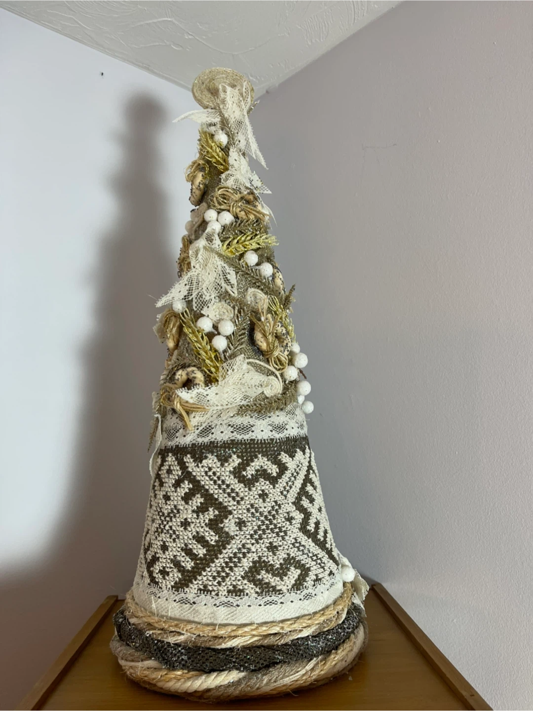 Selling a unique handmade decorative Christmas tree! It's beautifully crafted with lace, beads, and textured fabrics. Perfect for adding a touch of rustic charm to your holiday decor this season