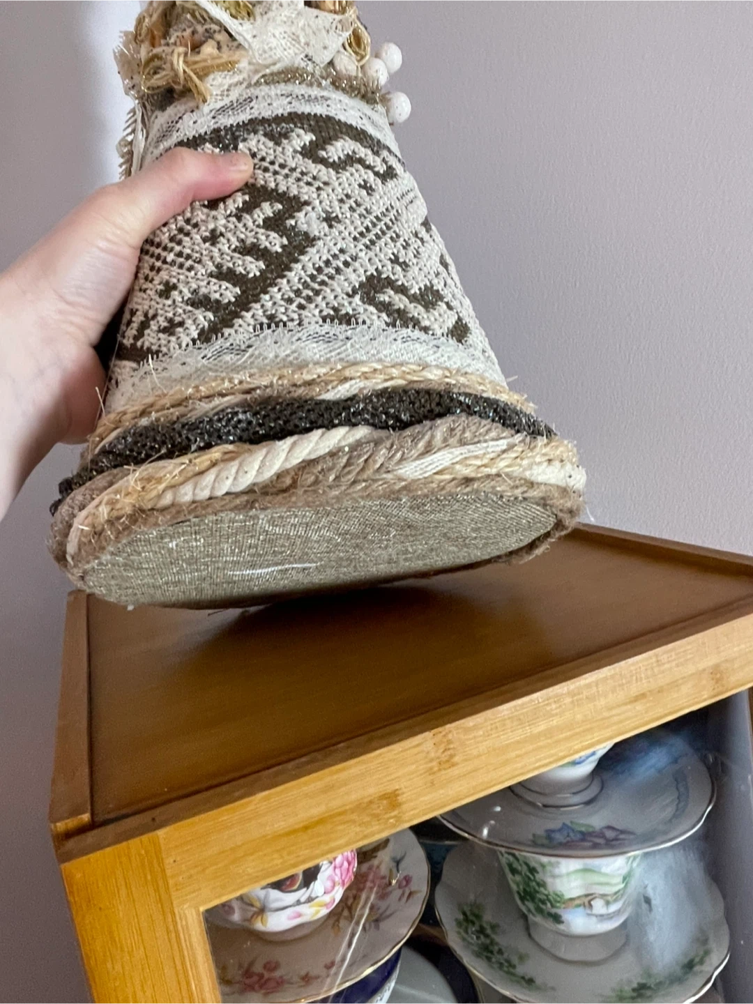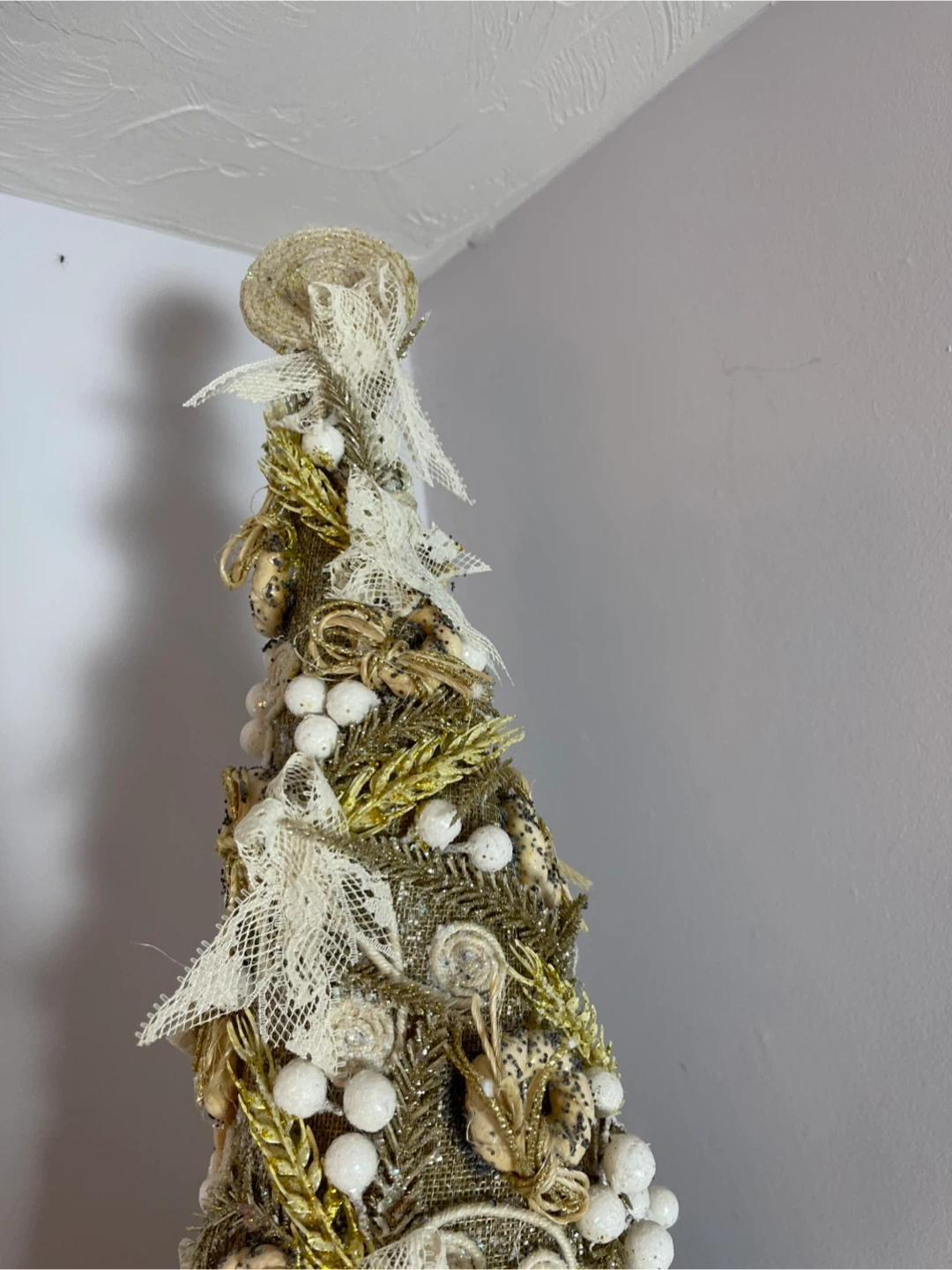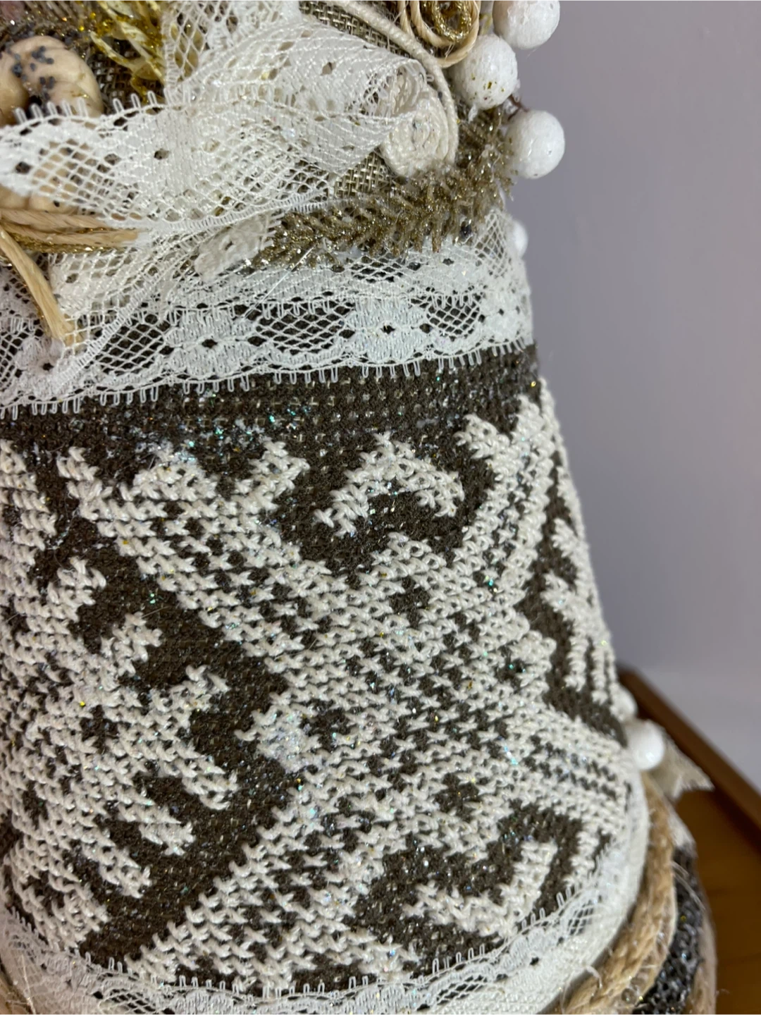 Selling a unique handmade decorative Christmas tree! It's beautifully crafted with lace, beads, and textured fabrics. Perfect for adding a touch of rustic charm to your holiday decor this season