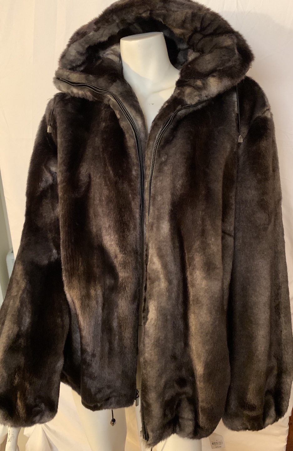Stay warm and stylish with hooded faux fur blouson coat from 1 Madison.