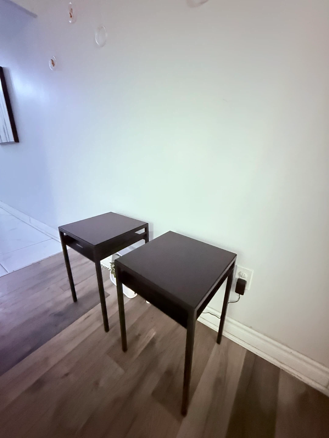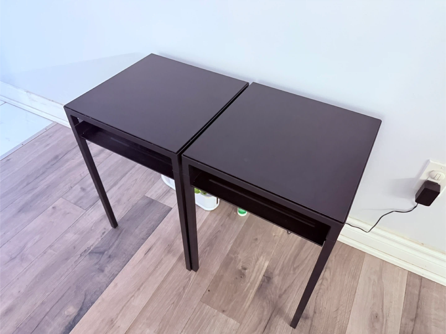 Selling a set of two black side tables. They're in great shape and would look lovely in any room. They have a simple, modern design with a shelf underneath for extra storage. Perfect for beside a bed or a couch!