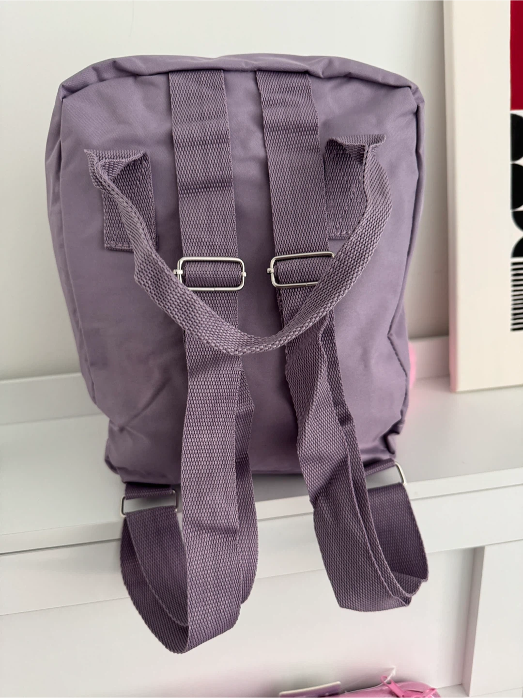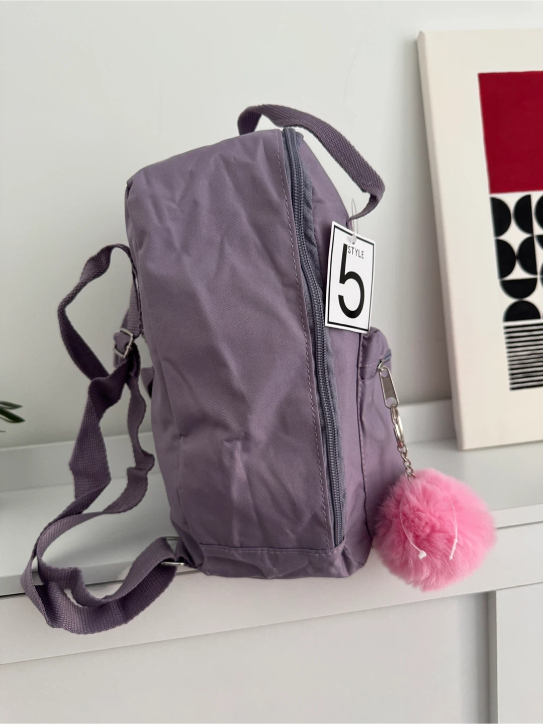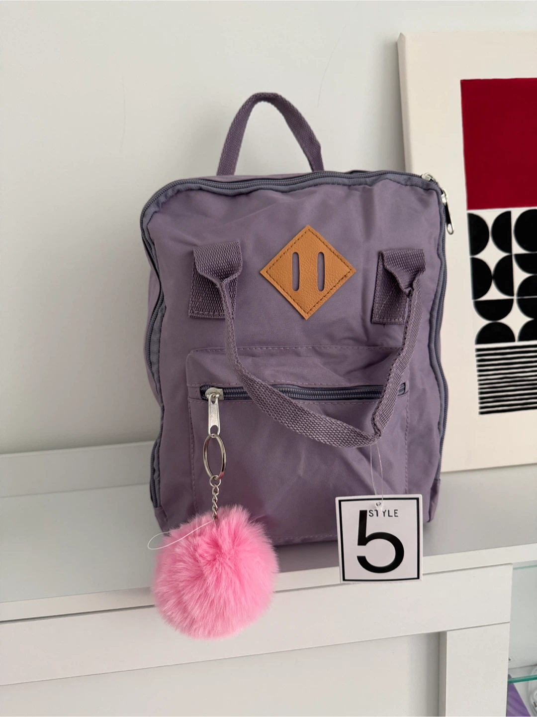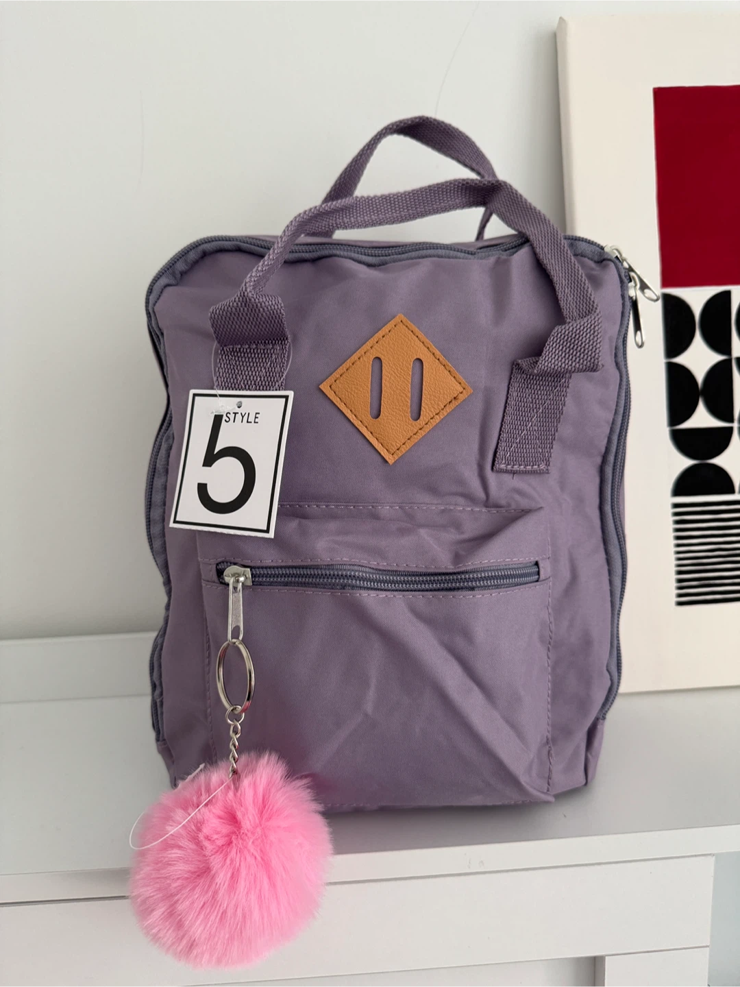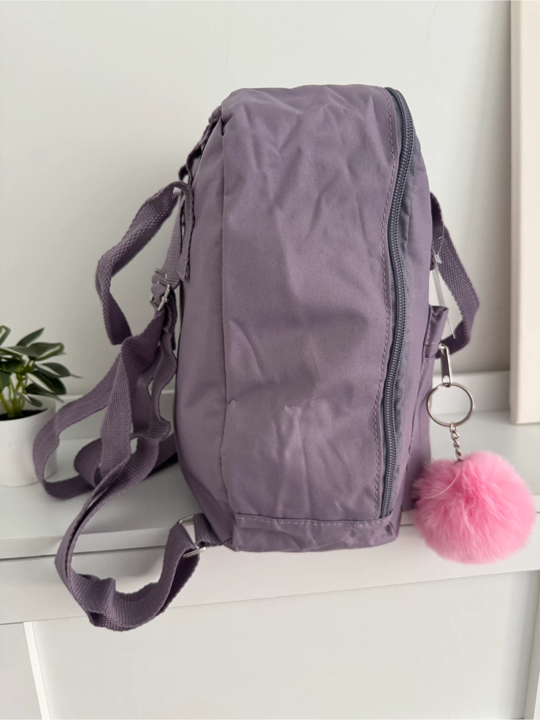 This is a cute purple backpack for kids or it can be as a lunch bag! It has a top handle and adjustable straps. There is a front pocket and comes with a fun pink pompom keychain.