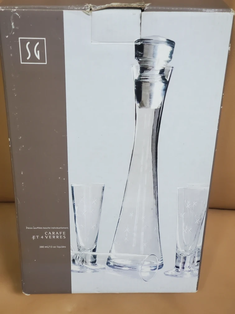 Selling a beautiful SG carafe and four glasses set! The box indicates that the pieces are mouth-blown. The carafe and glasses have a lovely star design etched on them. The set contains a carafe and four glasses, with a total liquid capacity of 380 mL or 13 oz
