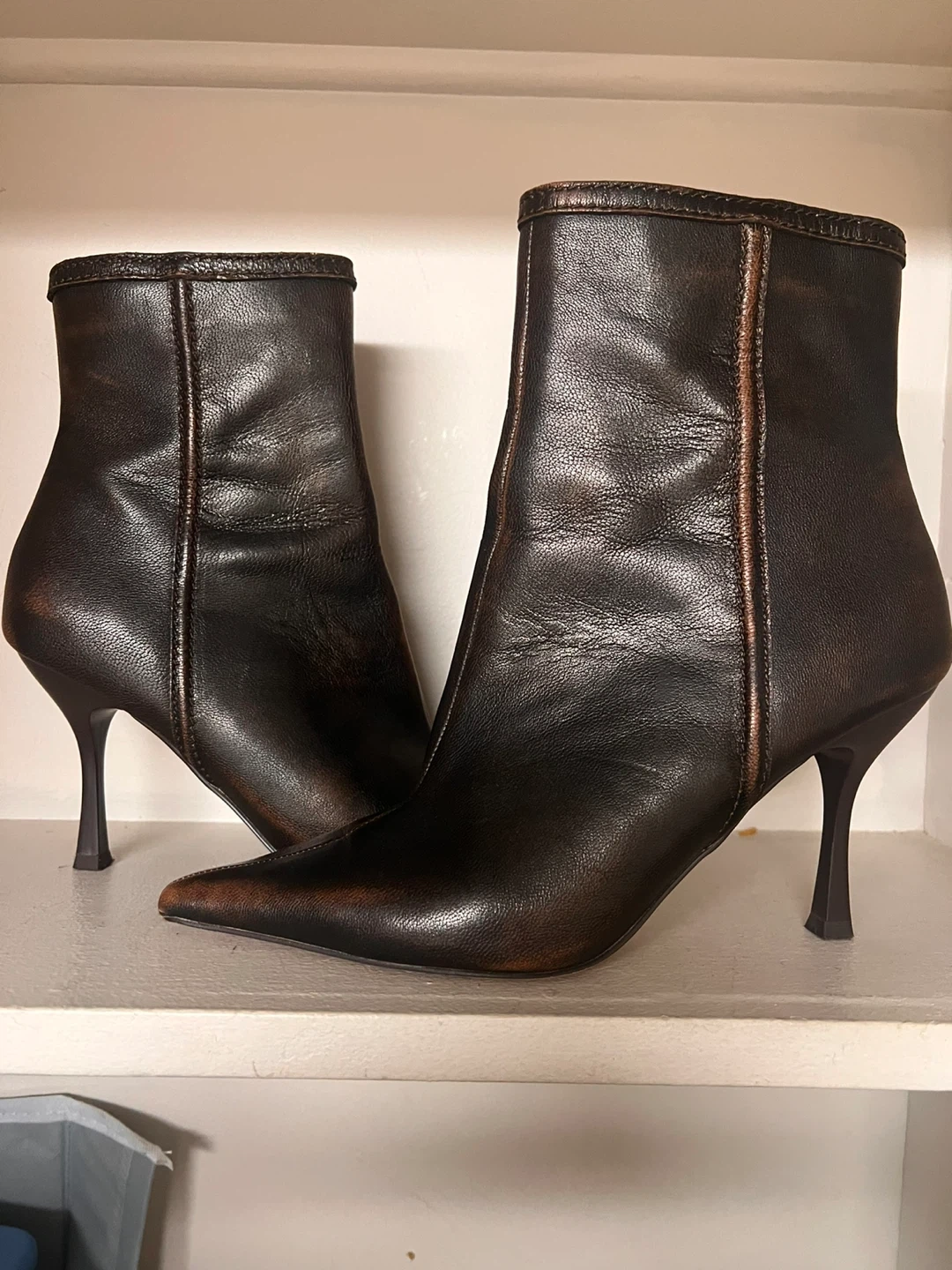 65Stylish heeled ankle boots in a dark brown leather! They have a pointed toe and a zipper closure on the side.