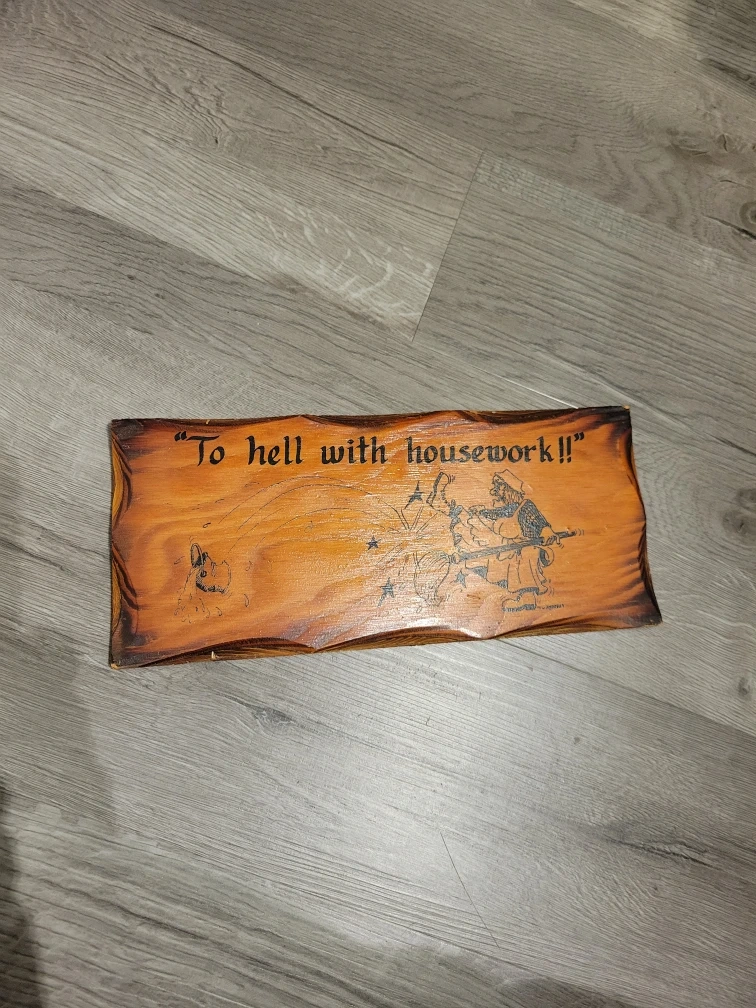 This is a vintage wooden sign with a humorous saying, "To hell with housework!!" along with a witch graphic. It's a unique decorative piece with a rustic charm.
