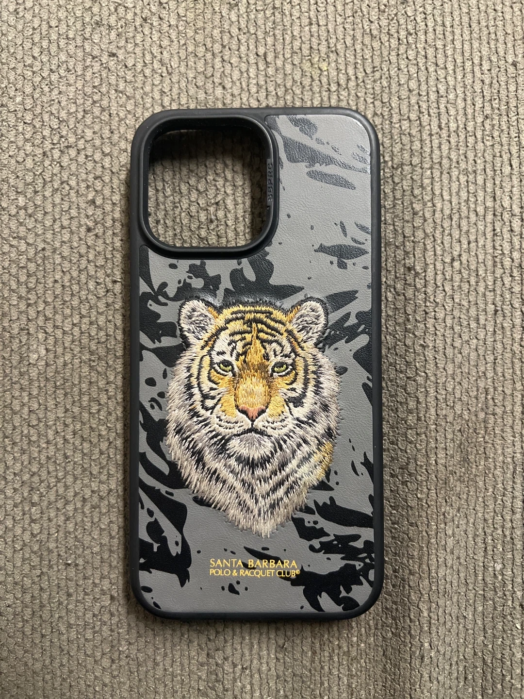 65Selling a Santa Barbara Polo & Racquet Club iPhone 14 Pro case. It features a cool tiger design on a grey background. It's in great shape and ready for a new phone!