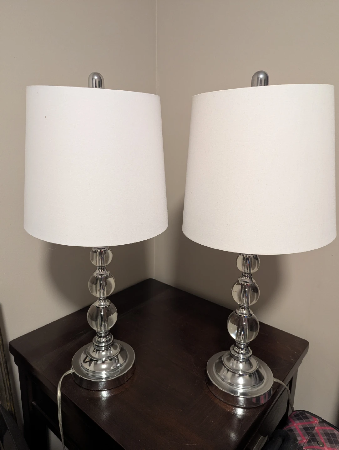 Selling a pair of lovely table lamps! They feature a classic design with a white shade and a stylish chrome base with decorative glass balls. They'd look great in a bedroom, living room, or office space. They are in great condition and ready to brighten up your home!