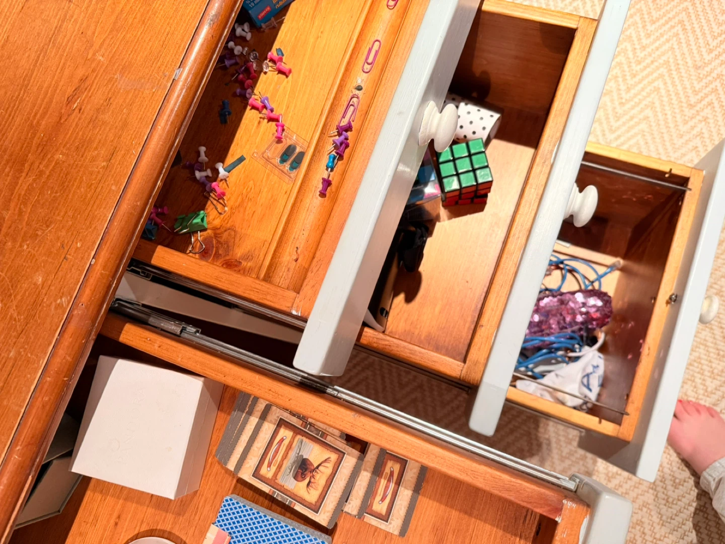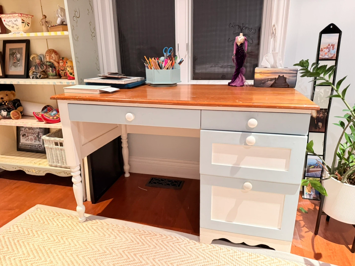 Selling a wooden desk with drawers. It's a sturdy desk with a light blue and white painted finish. It has some signs of use, but it's still in good condition and perfect for a home office or student.