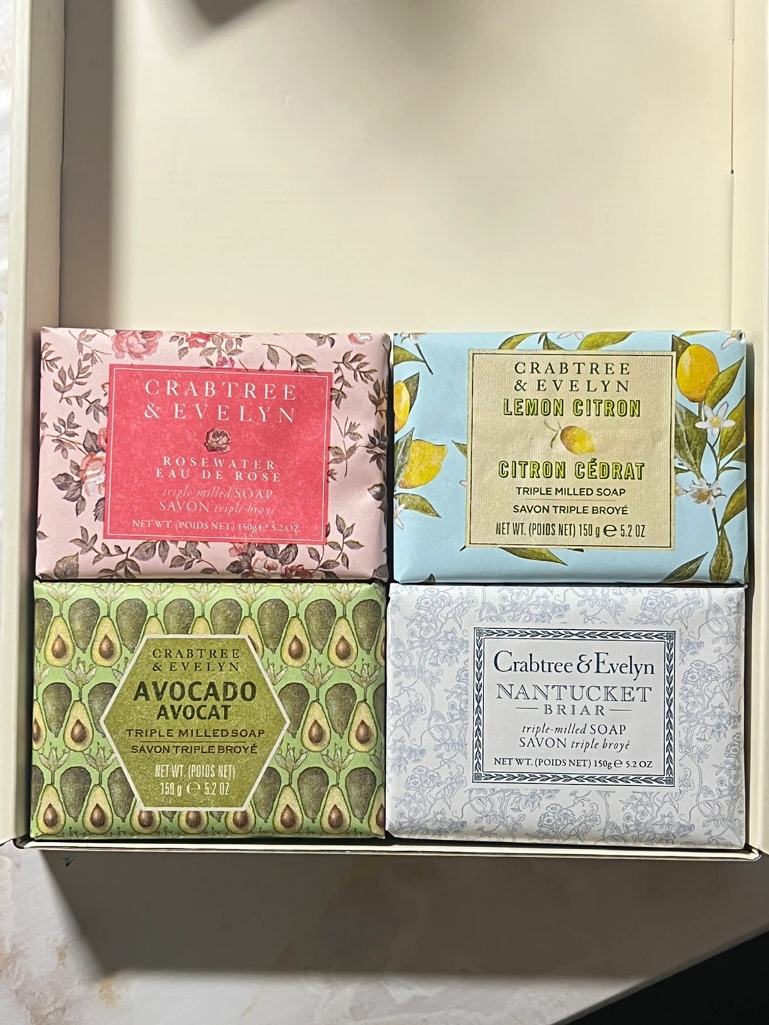 88New and never open $3 each Selling a set of Crabtree & Evelyn triple milled soaps. This set includes Rosewater, Lemon Citron, Avocado, and Nantucket Briar scents. Each soap is 150g (5.2 oz). Cash only Pickup only