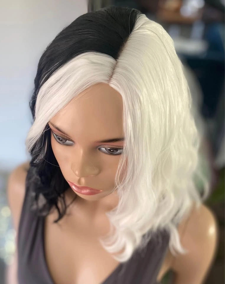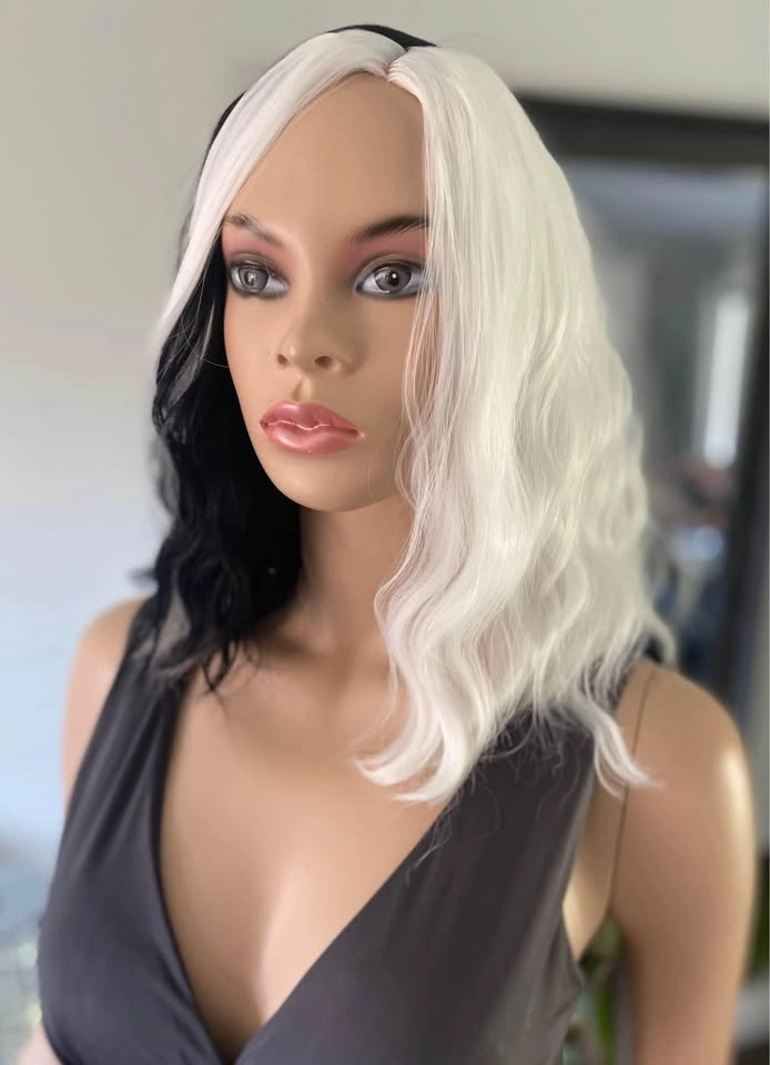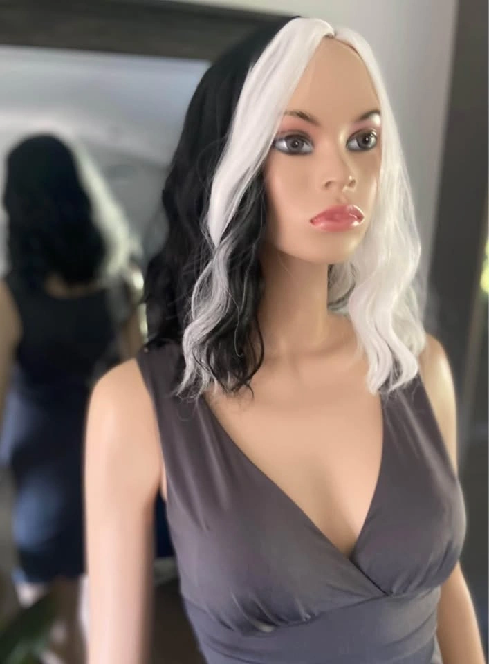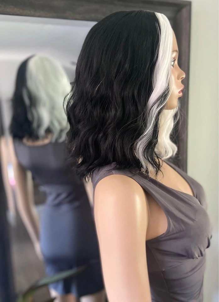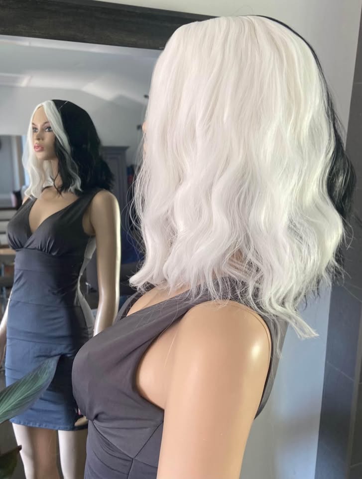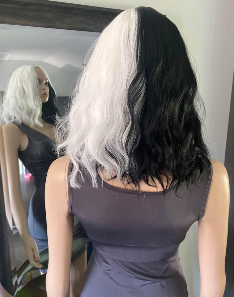 NWOTShoulder-Length Wavy Black & White Cruella DeVille 101 Dalmatians Synthetic Wig, Side Part 2170