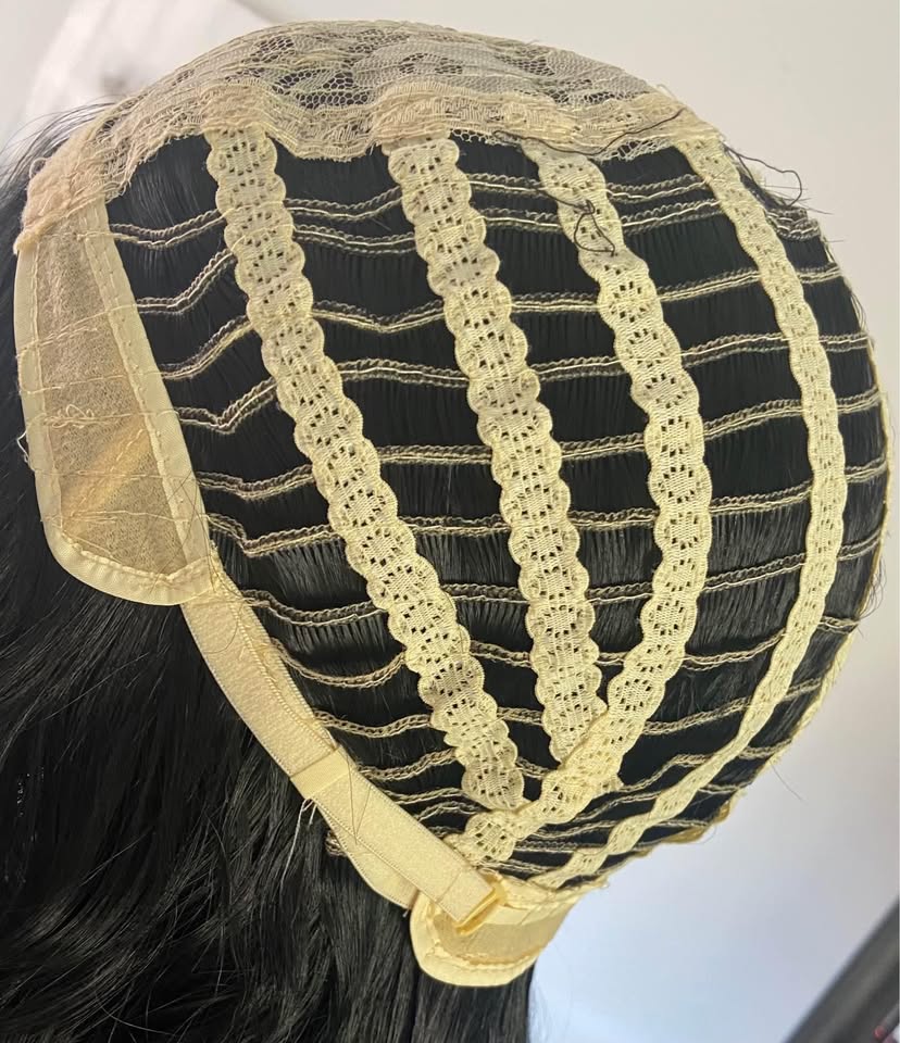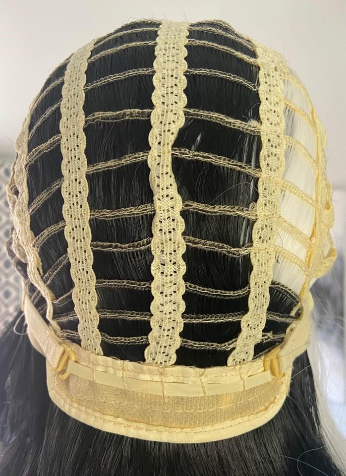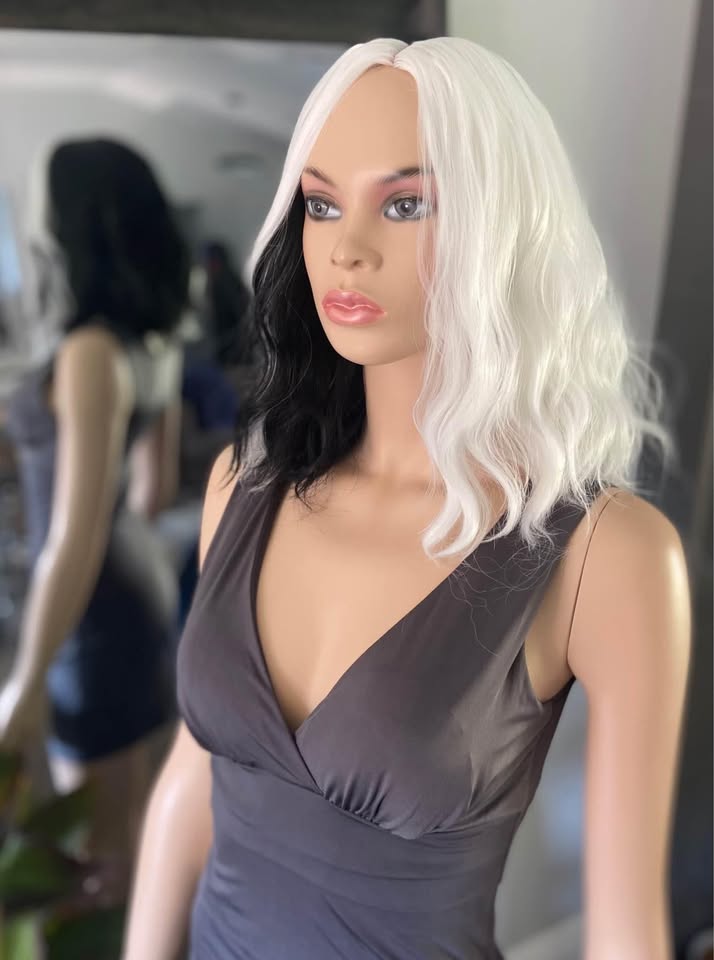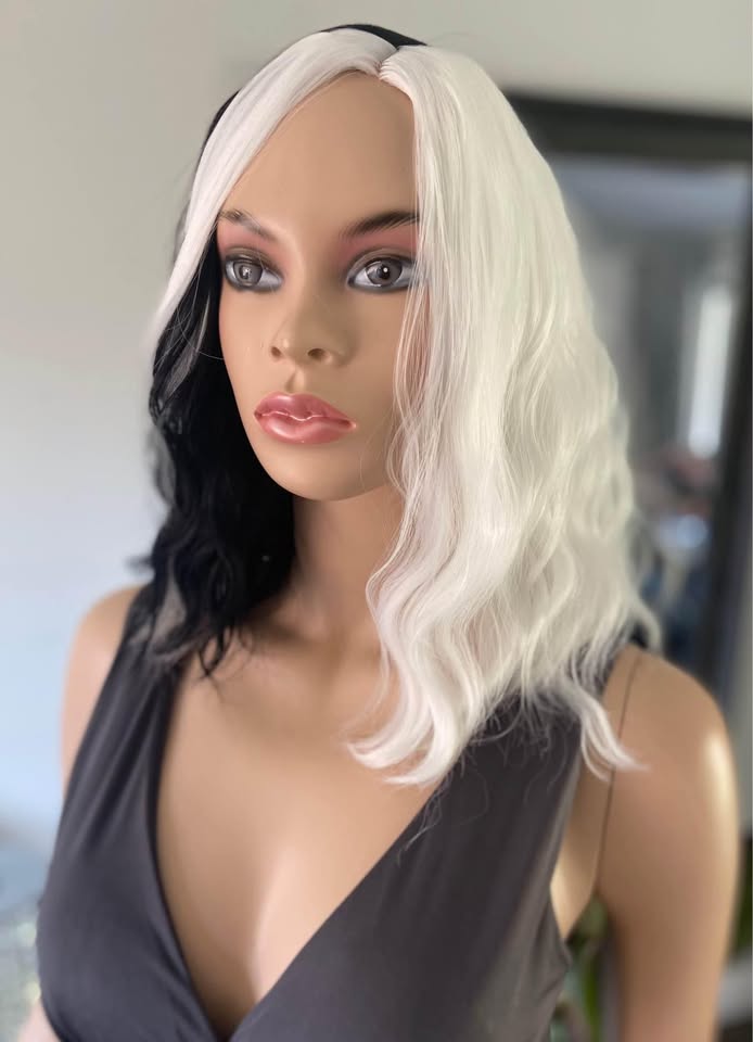 Shoulder-length, wavy, black & white wig with side parting, no bangs