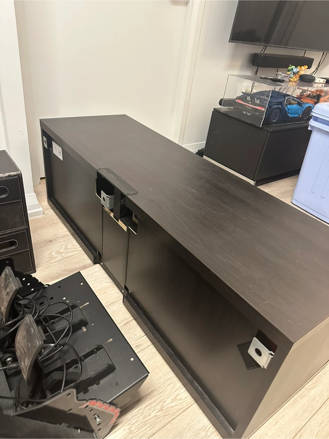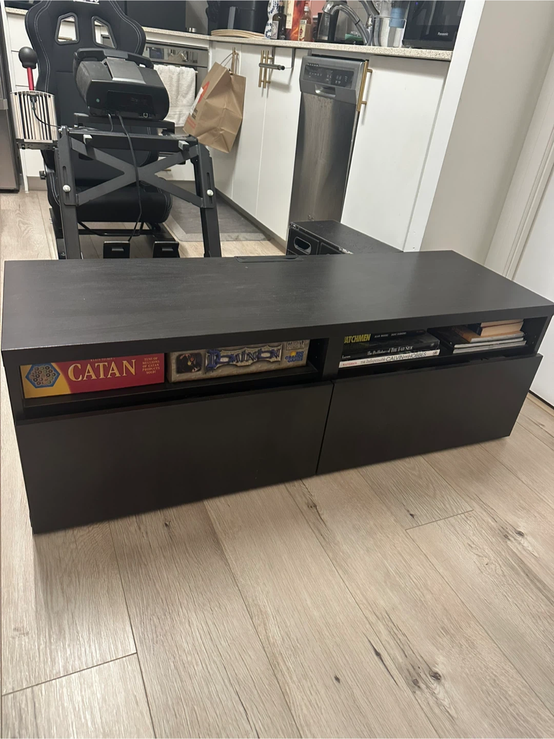 Selling a black-brown IKEA Besta TV unit! It's in good condition and ready to find a new home. Perfect for organizing your entertainment setup or displaying your favourite board games!