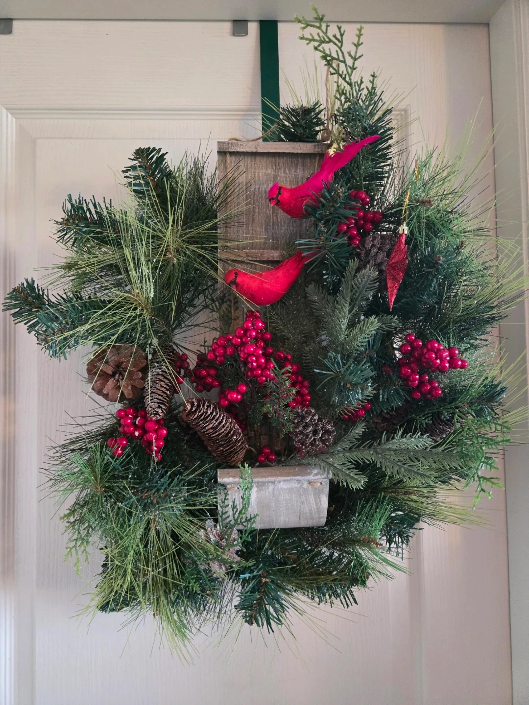 Here's a festive Christmas wreath to brighten up your home this holiday season! It features lovely red cardinals and berries nestled among the evergreen branches